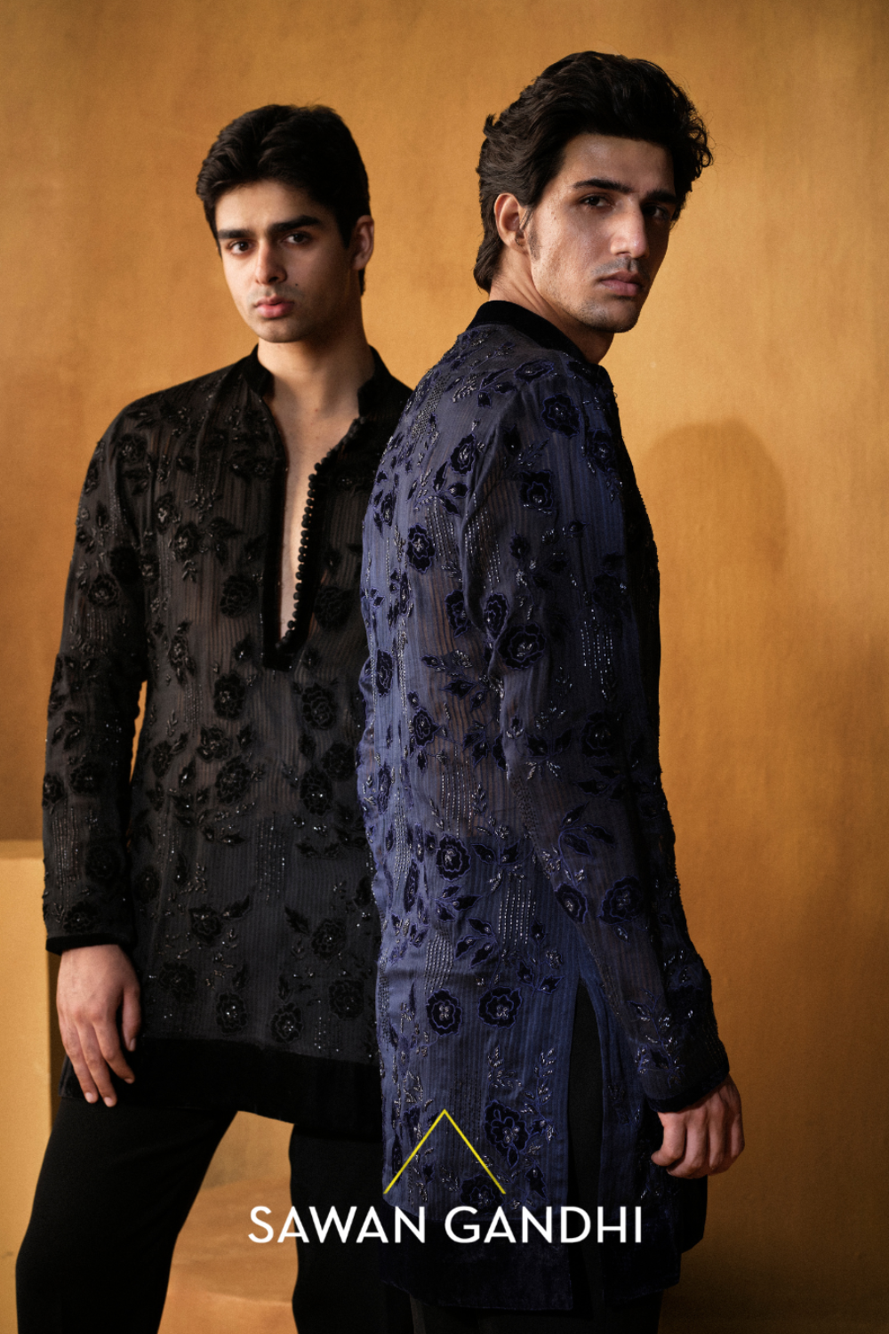 A black kurta featuring bold applique embroidery, adding depth and texture to the silhouette. Styled with black pants for a contemporary yet traditionally rooted look.