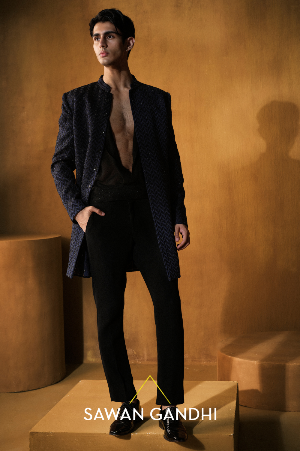 A contemporary sherwani featuring a striking blue base with black detailing , elevated with subtle textural embroidery. Styled with black pants, it creates a bold and modern silhouette with regal undertones.
