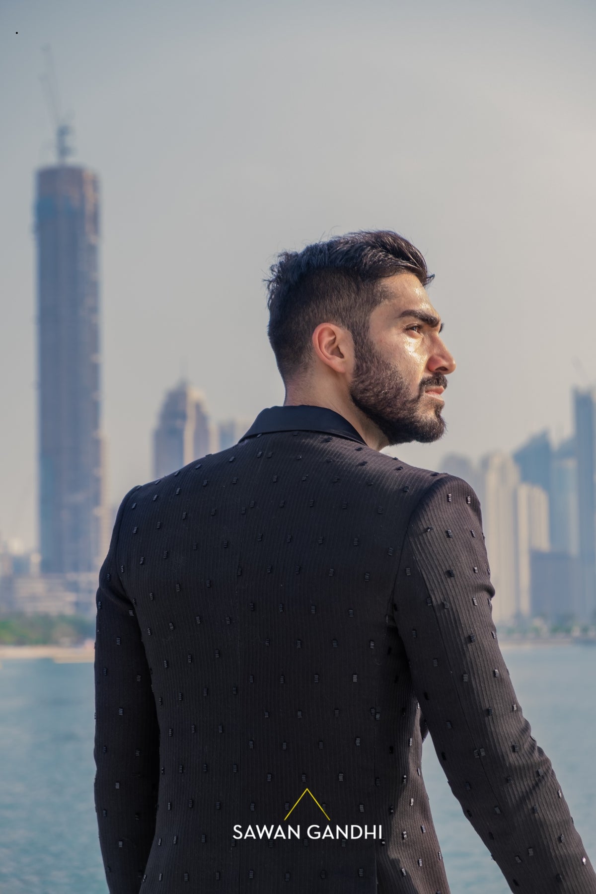 Black ghicha organza jacket with cutdana work and satin lapel.