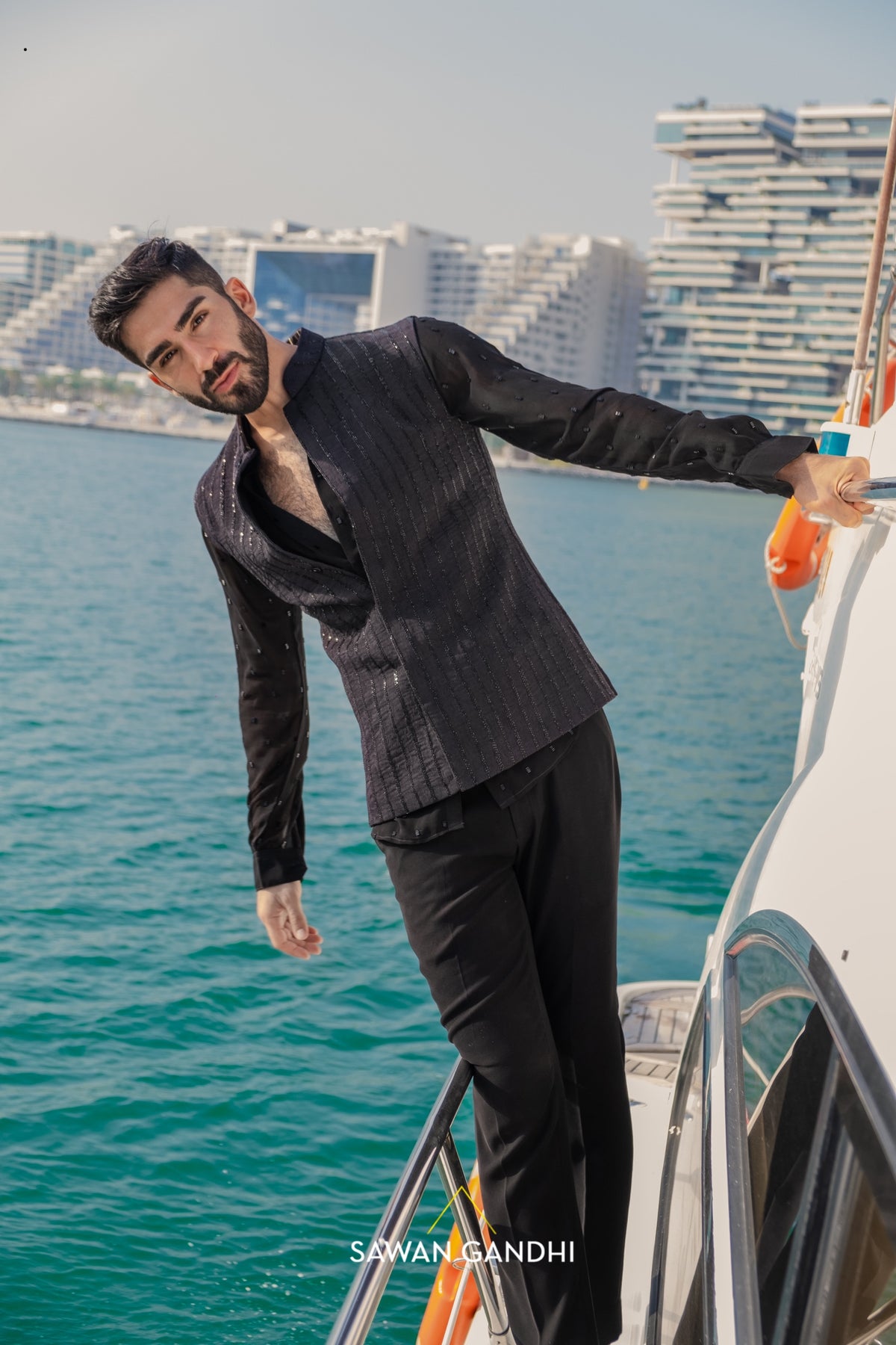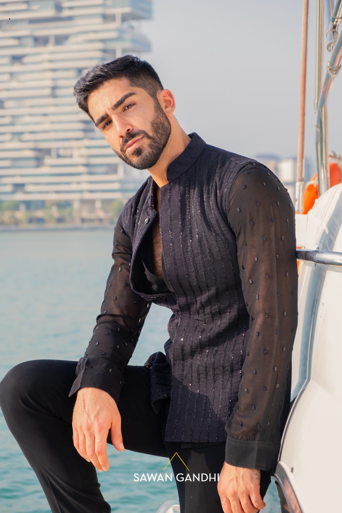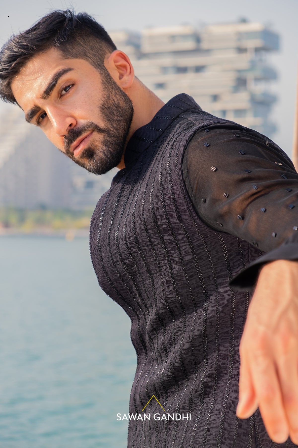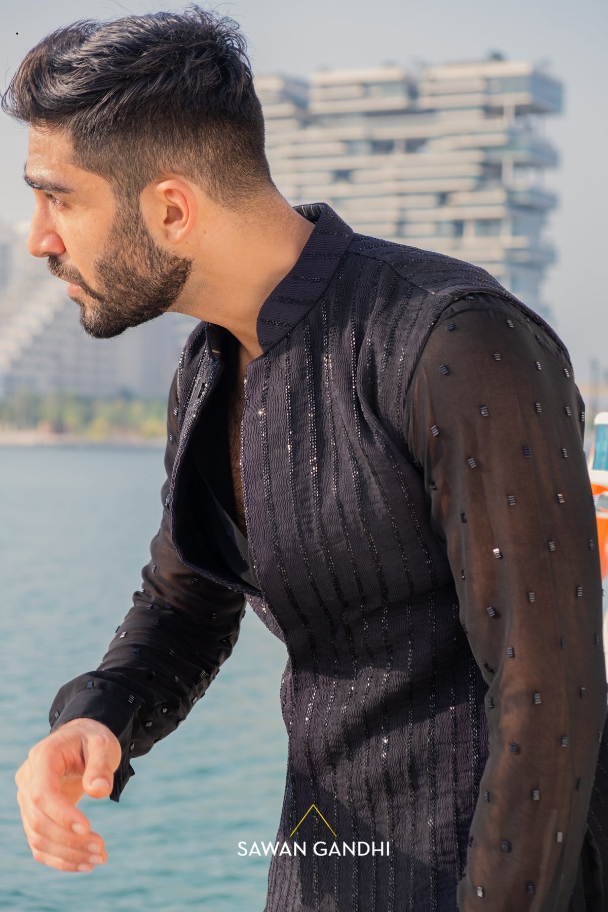 Black pintux nehru with cutdana work lines .