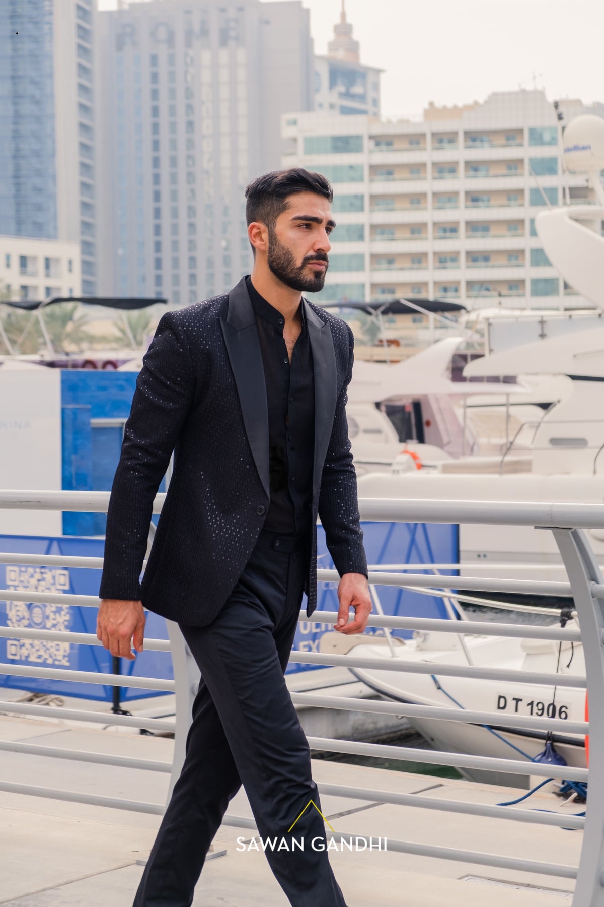 Black georgette jacket having sequins work and satin lapel.