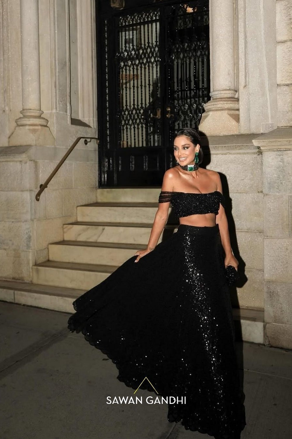 Black tone on tone sequins lehnga having cutdana scallop border paired with crystal work off shoulder blouse