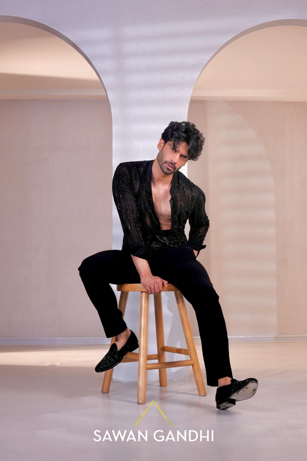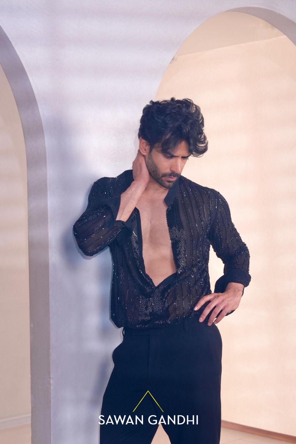 Black georgette sheer shirt with cutdana and swarovski work shirt paired with pants.