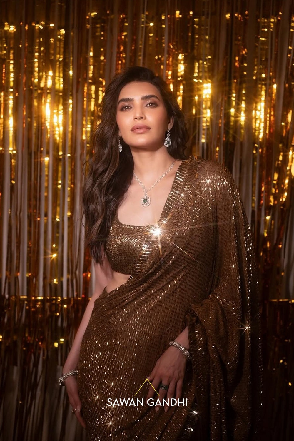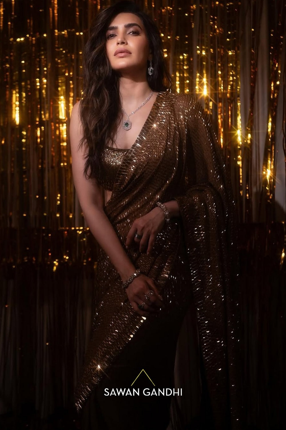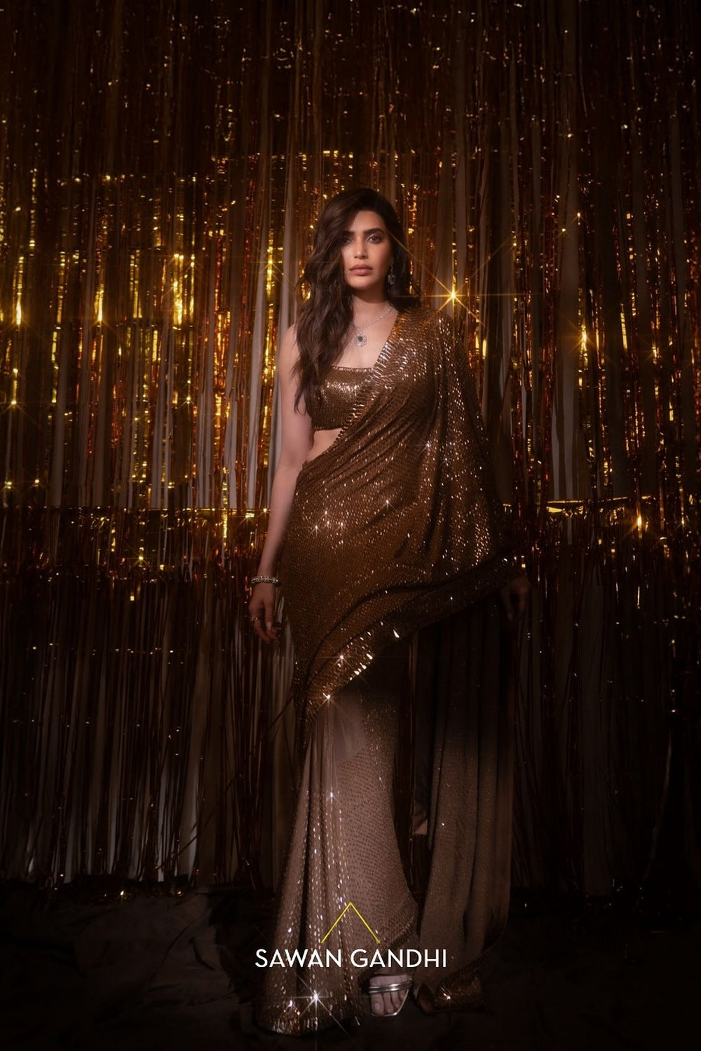 Coffee Gold Kashti saree is hand embroidered with trims which are scattered all over the saree with a beautiful heavy work border across the saree.It is paired with a kashti work blouse and a petticoat.