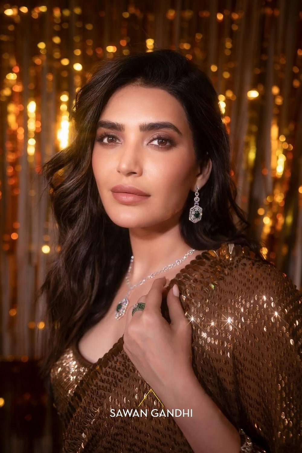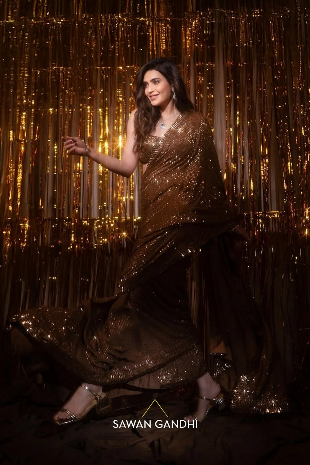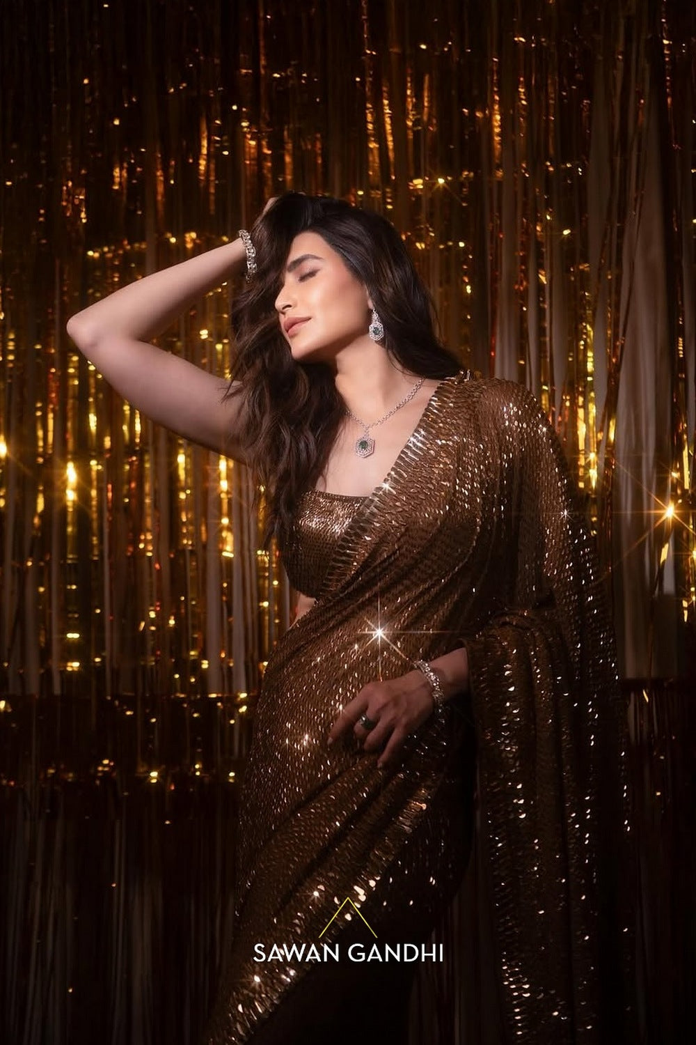 Coffee Gold Kashti saree is hand embroidered with trims which are scattered all over the saree with a beautiful heavy work border across the saree.It is paired with a kashti work blouse and a petticoat.