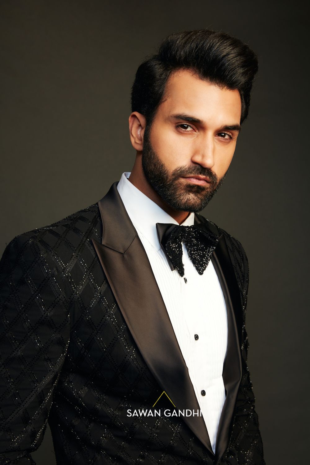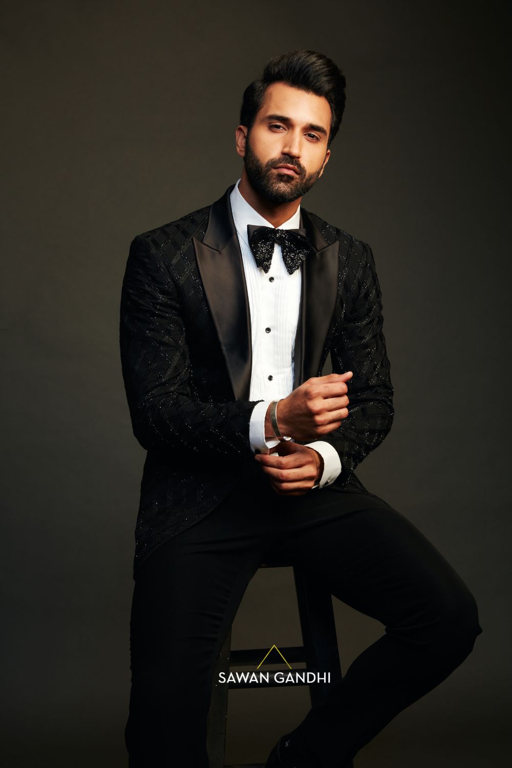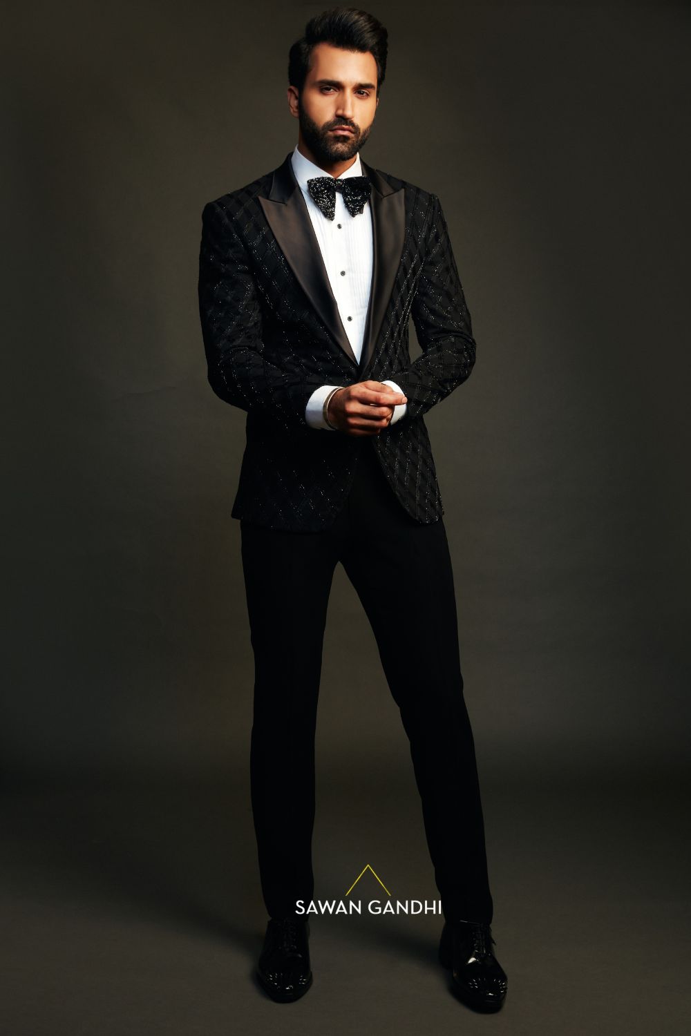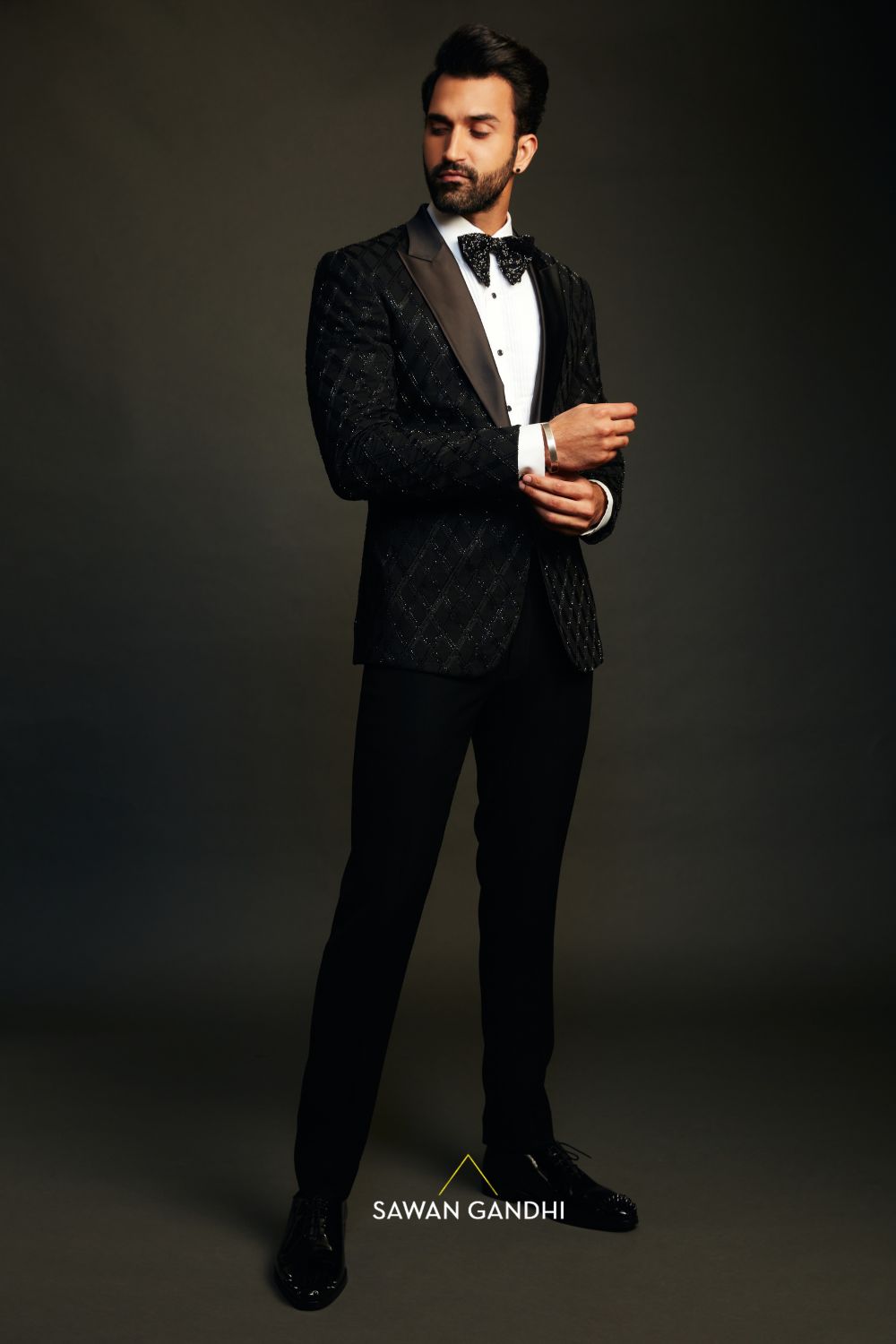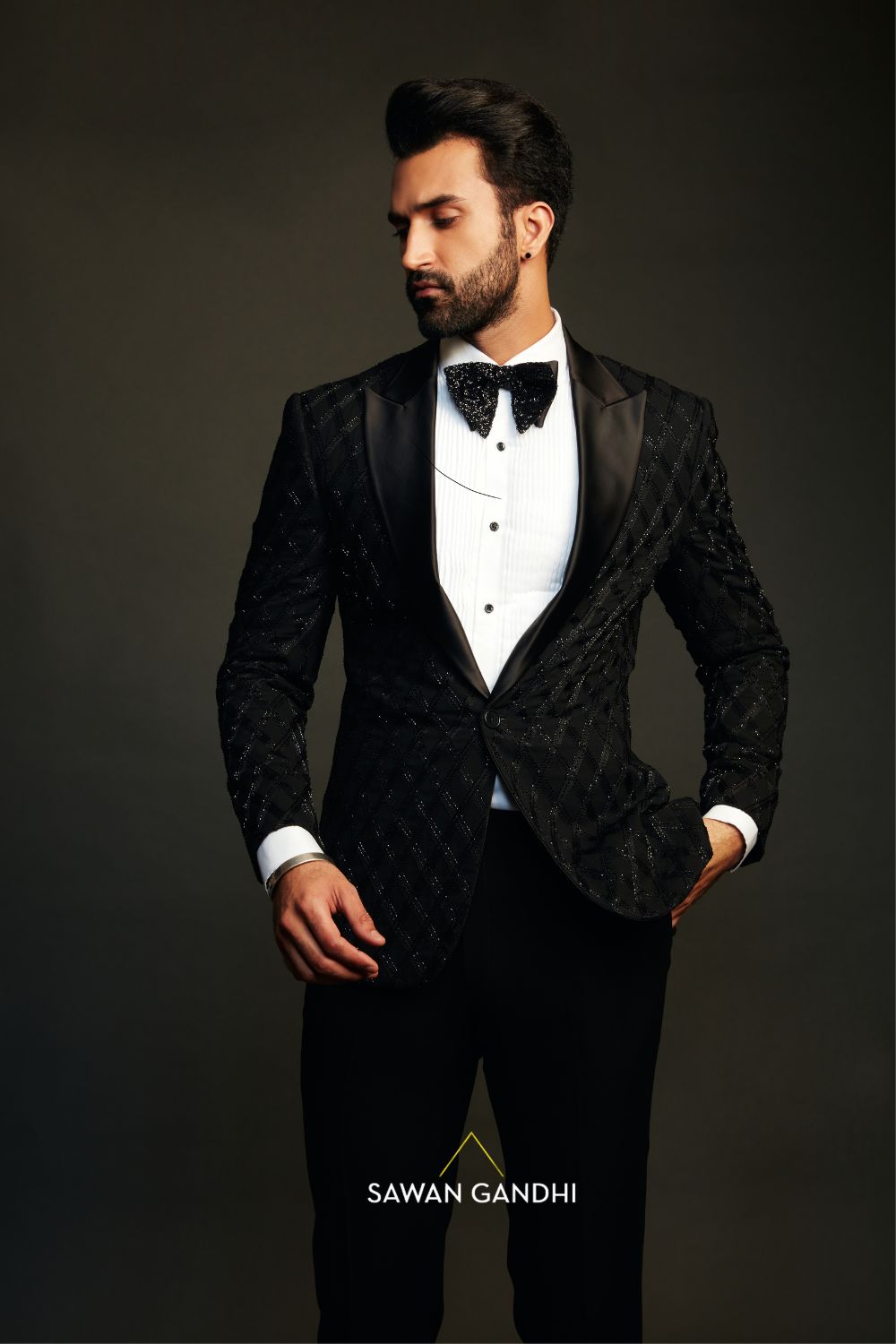 Black tuxedo with Crisscross pattern done with threadwork and cutdana