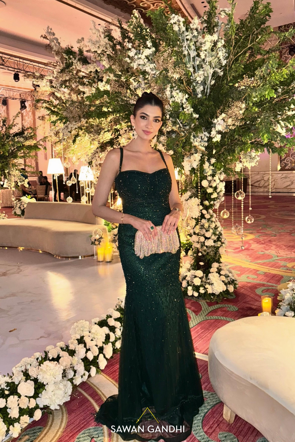 Bottle green crystal and swarosvki fishcut gownColor:- Bottle green Fabric:- GeorgetteNo of pcs:- 1