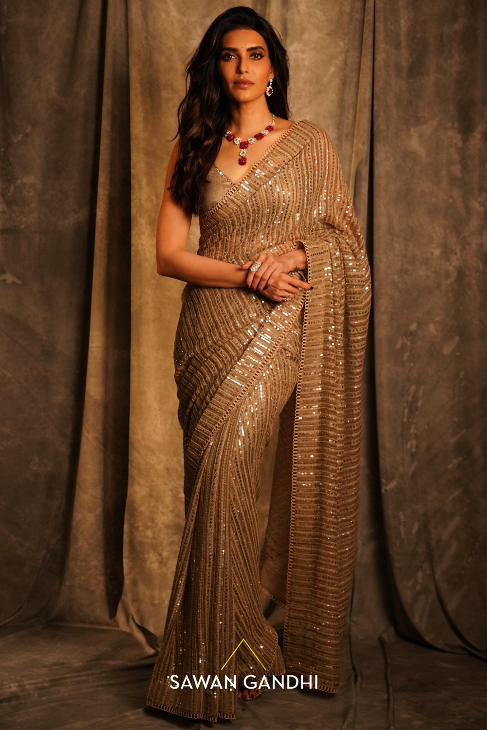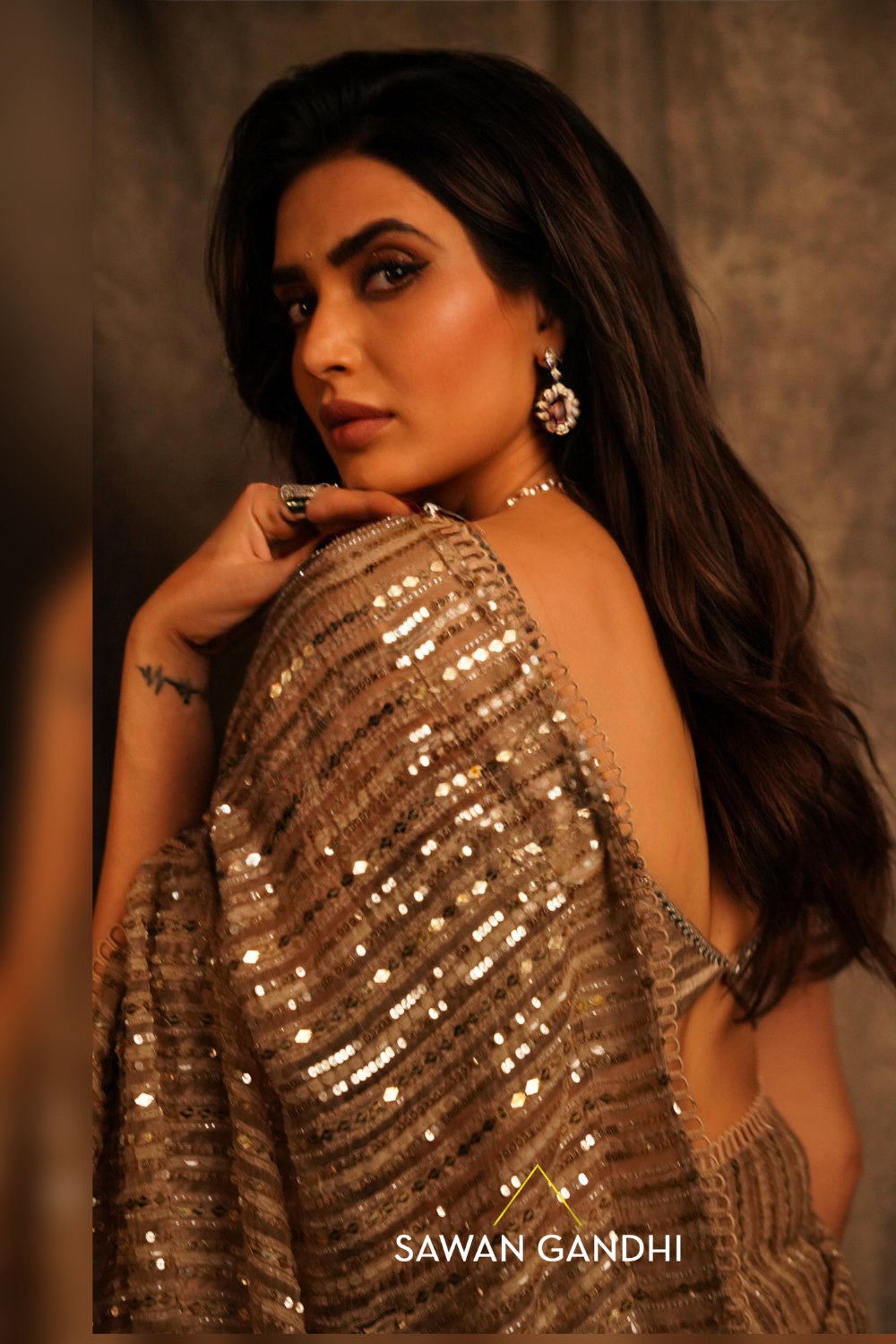 Taupe ghicha organza saree with sequins work paired with plain satin work blouse and petticoat.