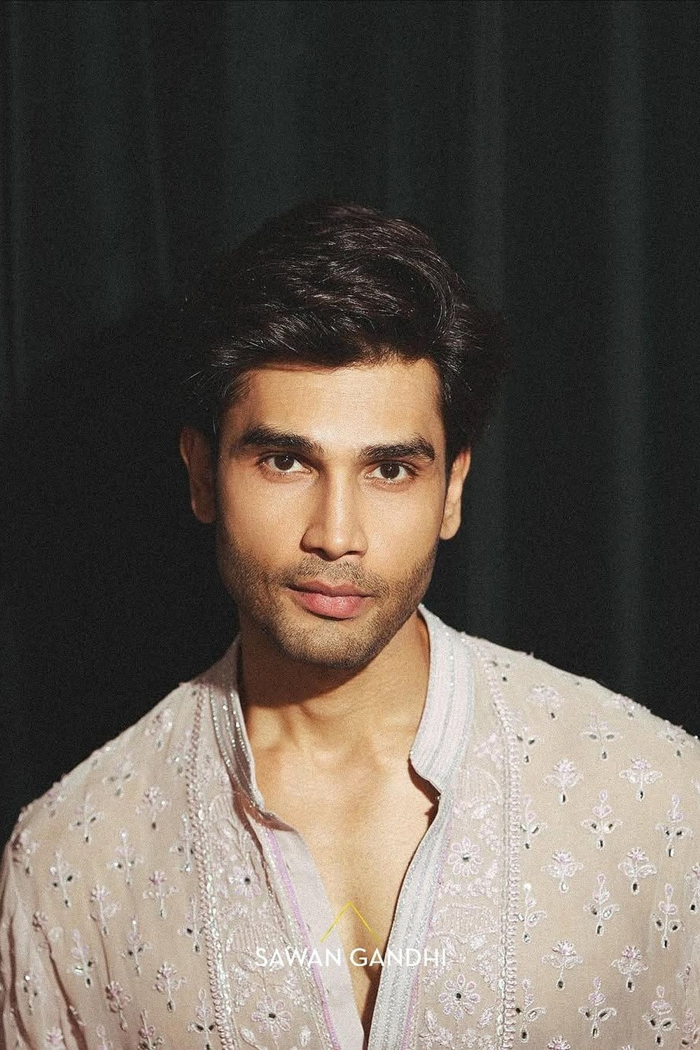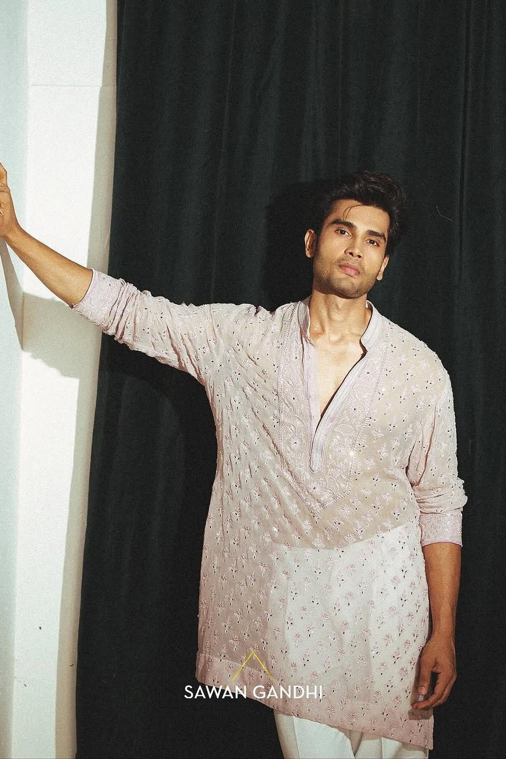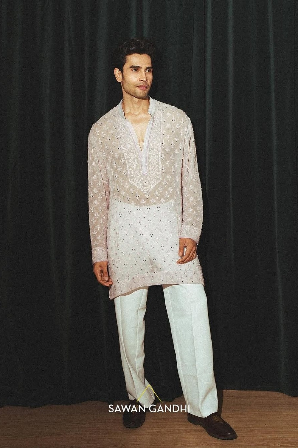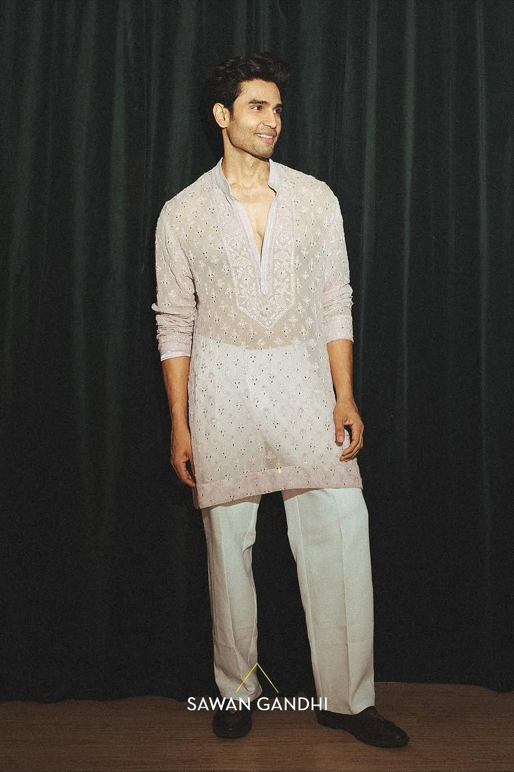 A lilac kurta with chikankari and mirror work and an intricately, detailed neckline paired with ivory raw silk pants.