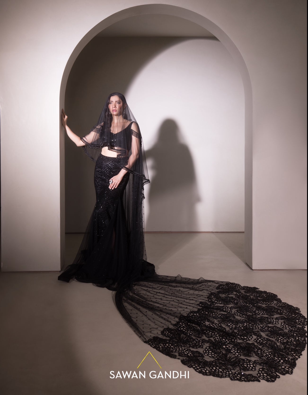 A sophisticated black crystal-adorned fish-cut skirt with a front slit, paired elegantly with a crystal-embellished blouse and a detachable net trail featuring intricate floral cutwork on the edges .
