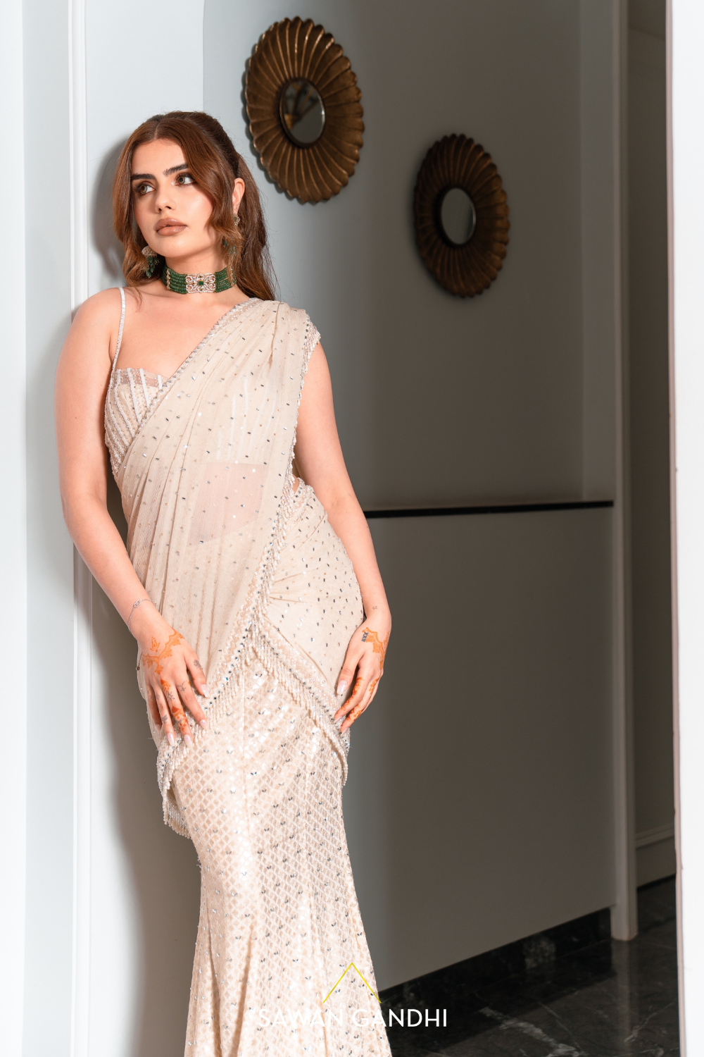 Ivory drape saree with mirror work paired with a bustier blouseColor:- Ivory Fabric:- GeorgetteNo of pcs:- 2