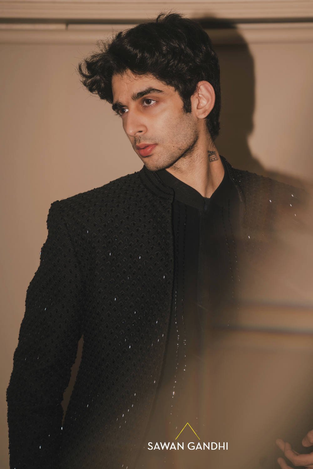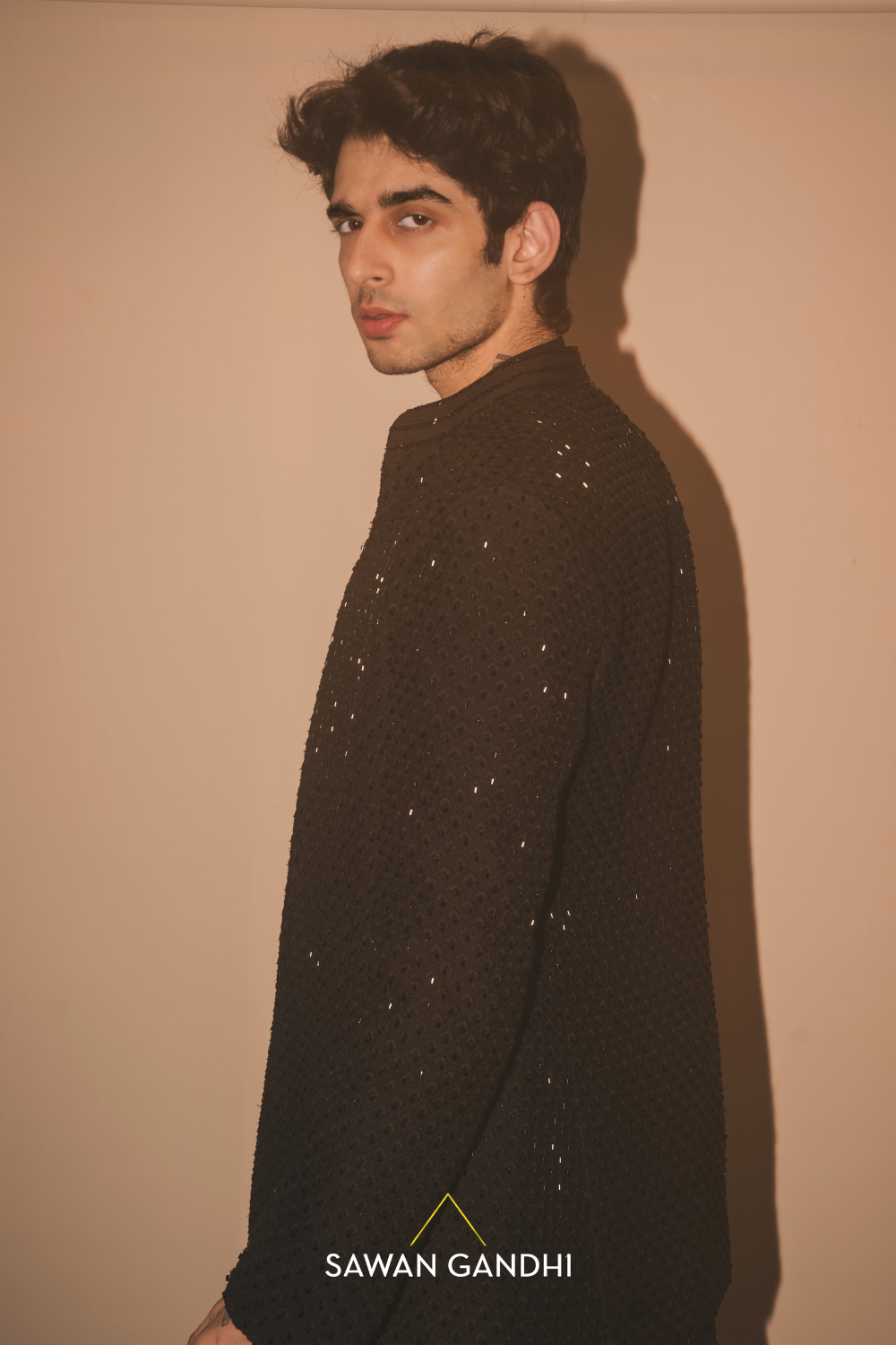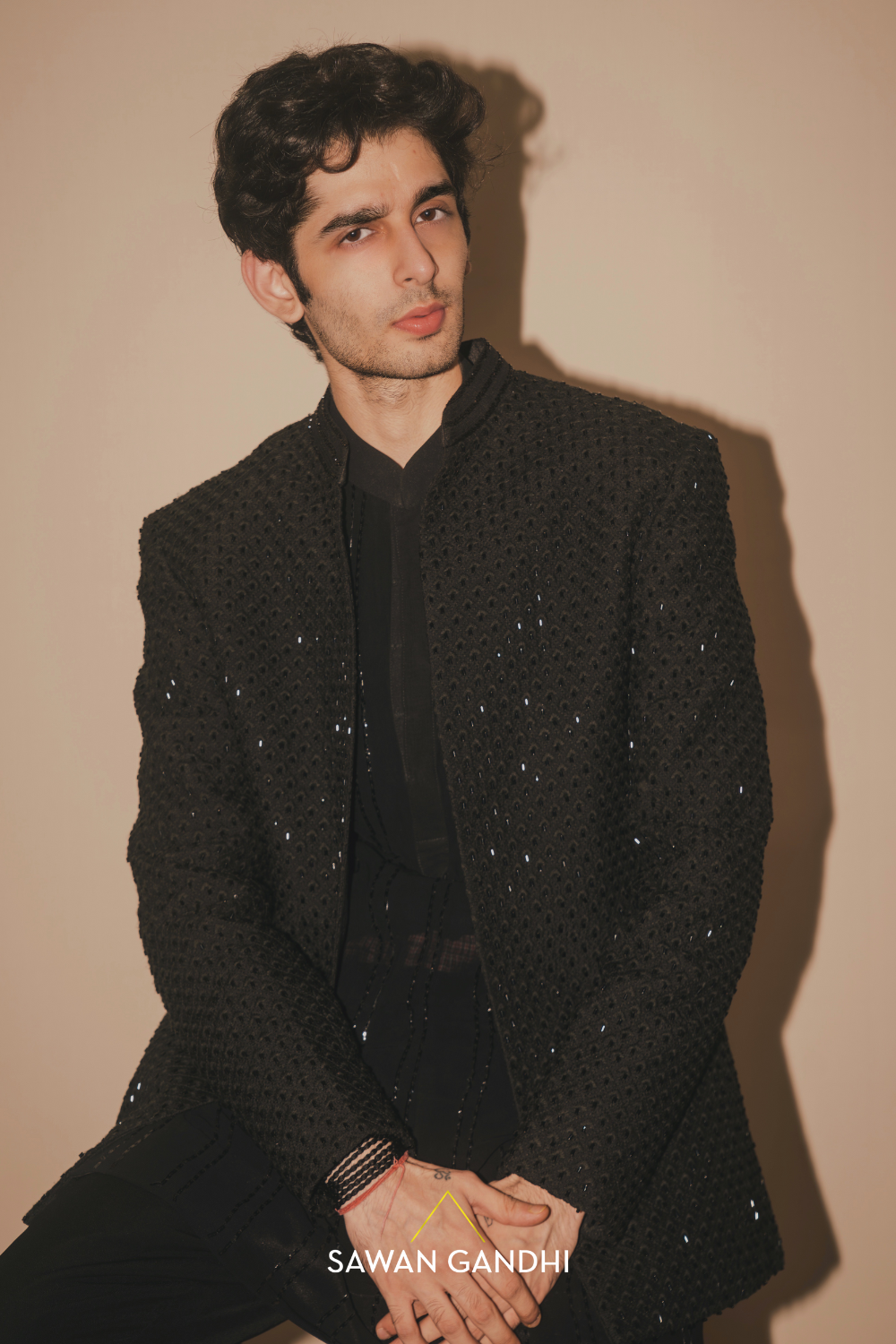 Black bandhgala with cutdana work paired with black pants. Kurta is separately prices for 48,000/-, Bandhgala-68000, Pants-18000