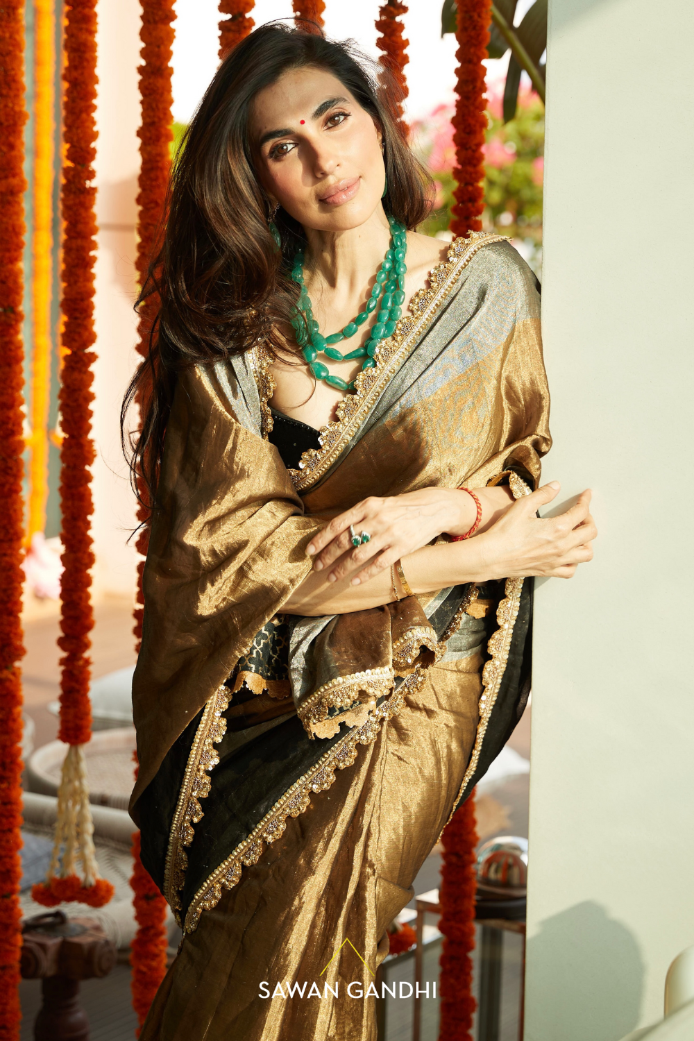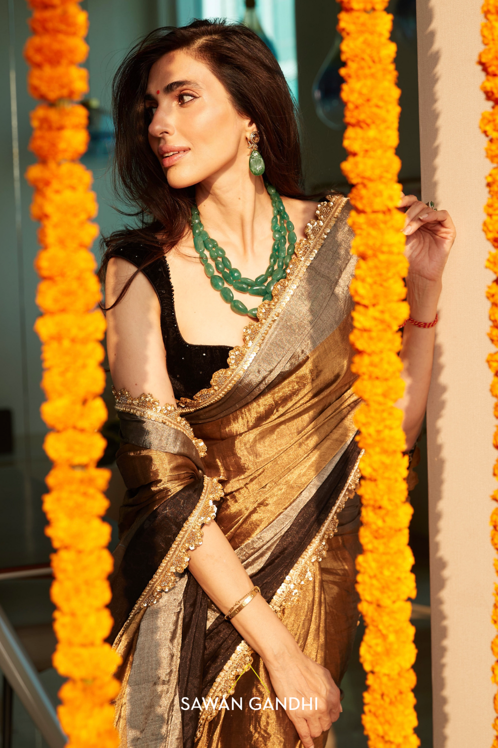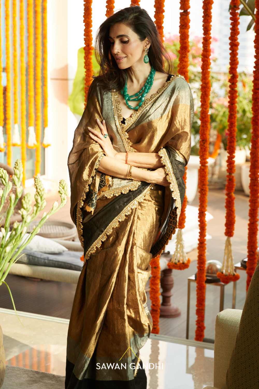 Tricolour ( silver, gold & black) tissue saree with scallop border paired with black velvet blouse and a petticoat Colour:- TaupeFabric:- OrganzaNo of pcs:- 3