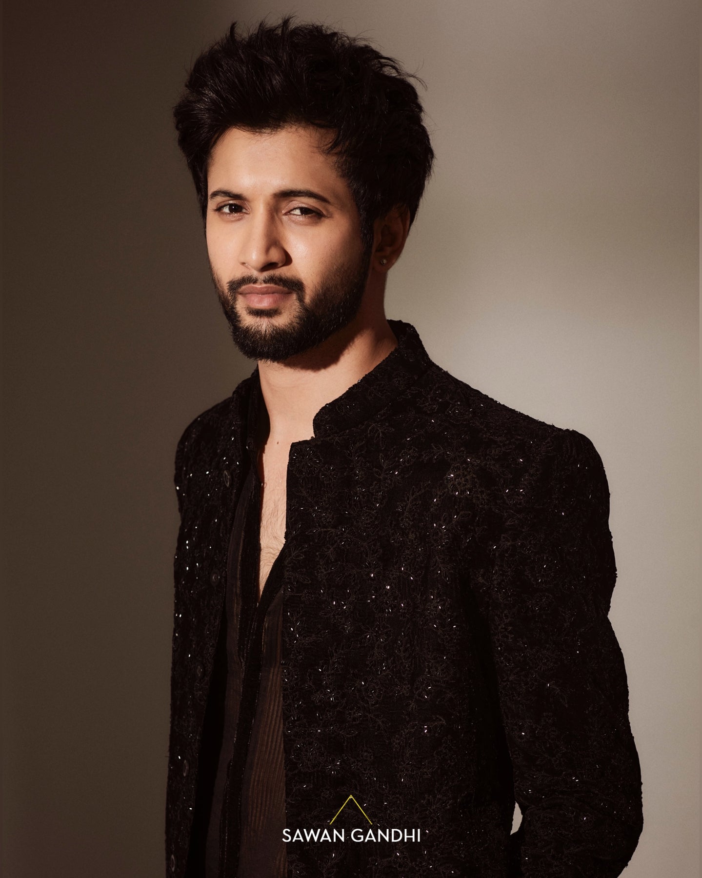 Black bandhgala with black cutdana embroidery in floral pattern paired with black gicha kurta and black pants.