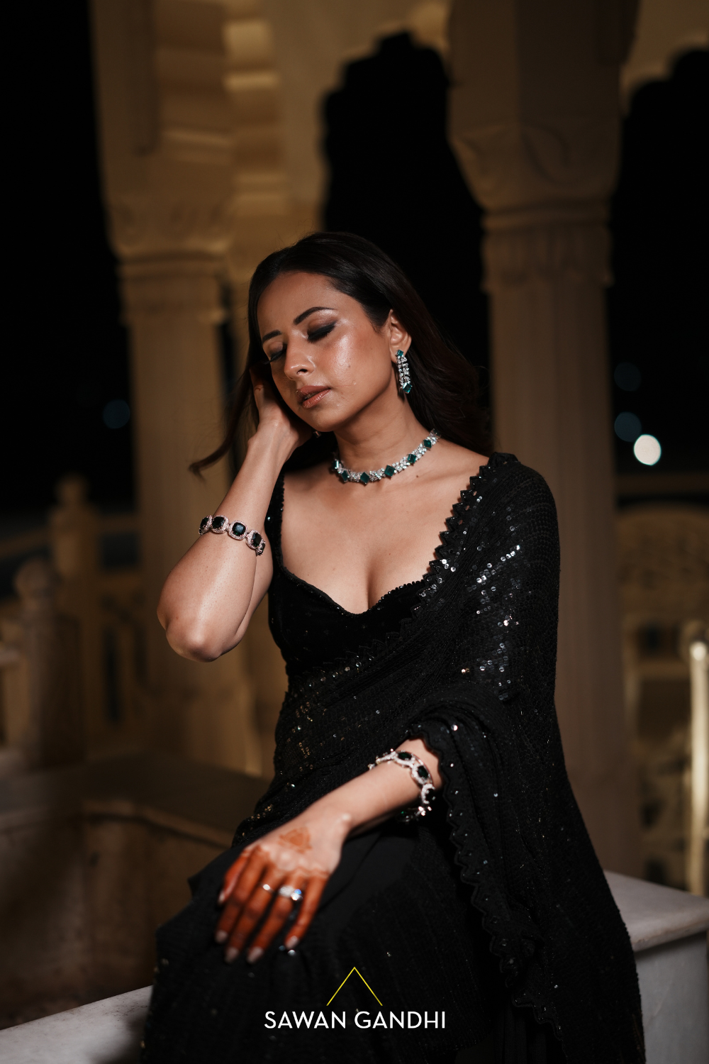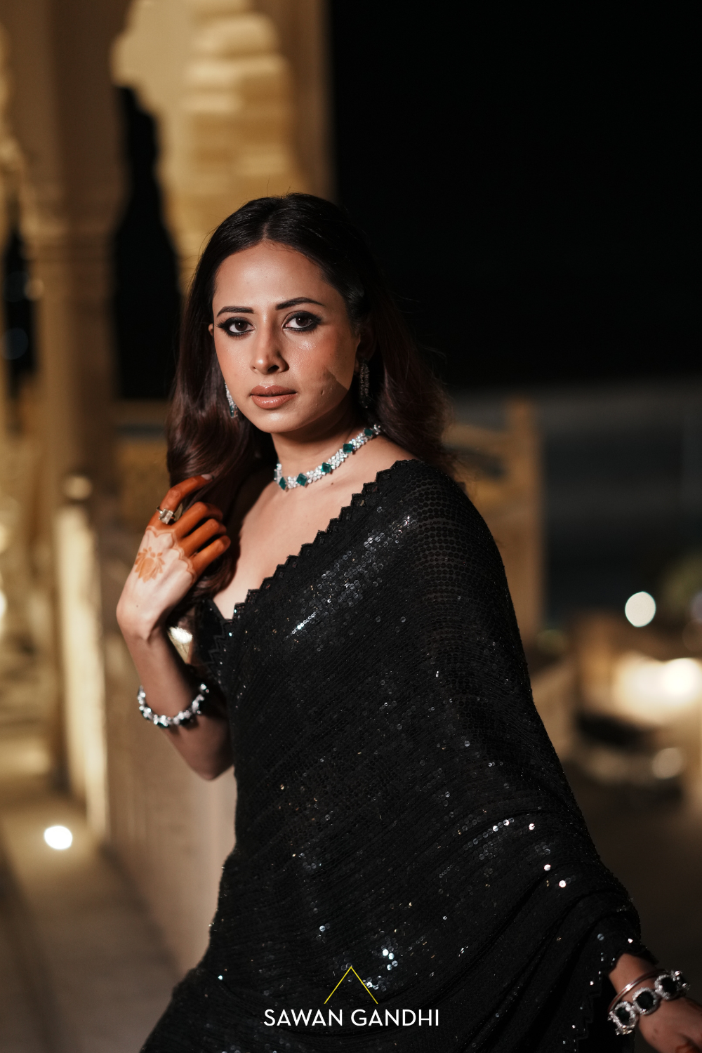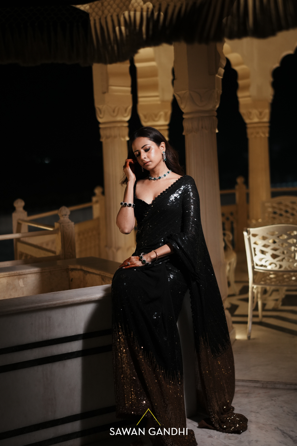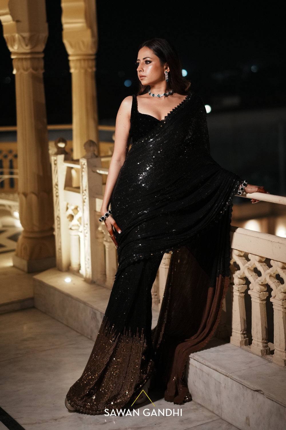 Black to gold ombre sequins saree paired with black velvet blouse adorned with sequins and a petticoat.COLOR:- Black to GoldFABRIC:- Georgette NO. OF PIECES:- 3