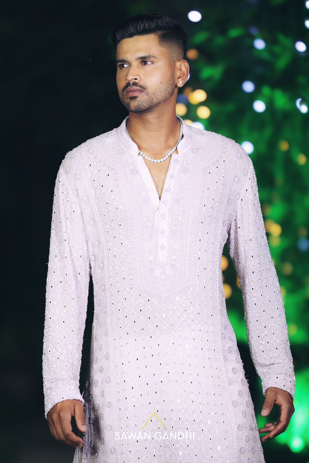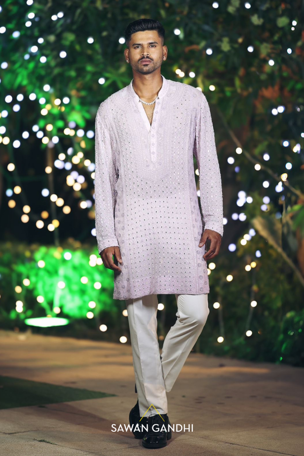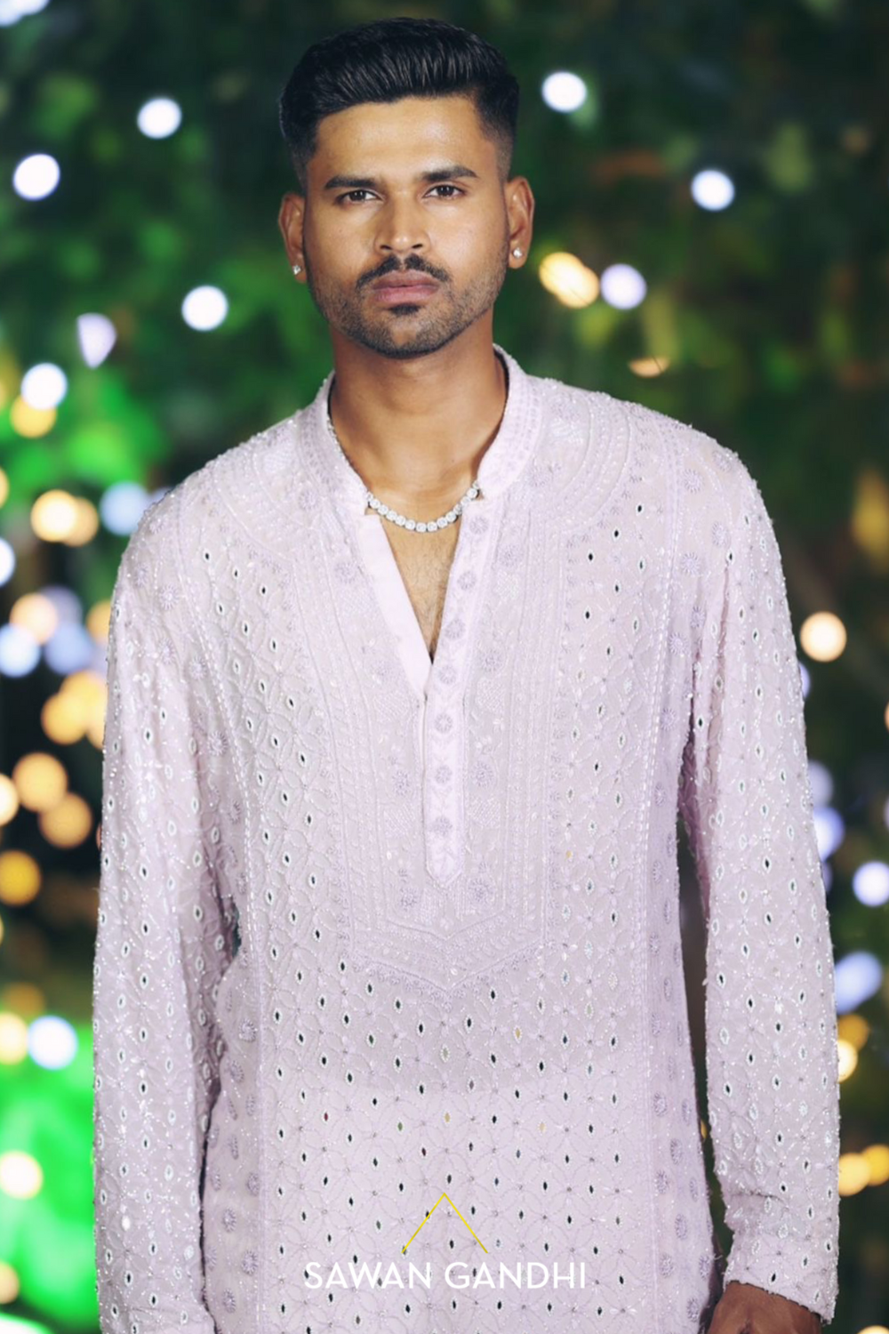 Lilac chikankari kurta with mirror and pearl detailing paired with ivory pantsSeparate Prices:- Kurta-138000 Pants-18000Colour:- LilacFabric:- GeorgetteNo of pcs:- 2