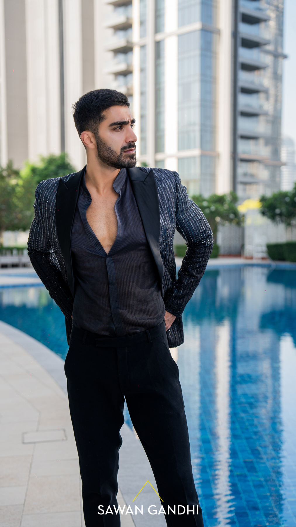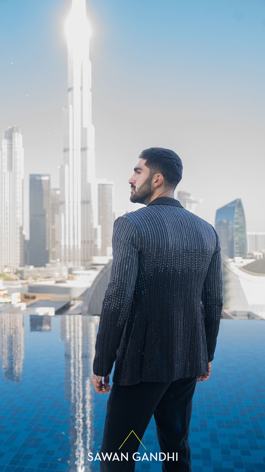 Grey to black ombre jacket with straight sequins lines with black straight lines shirt paired with black pants