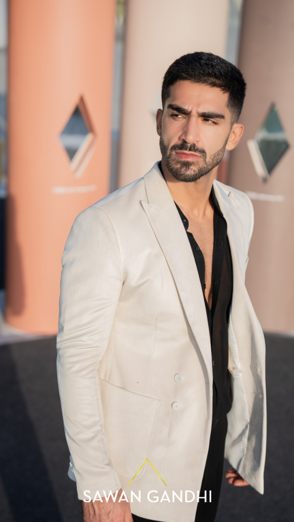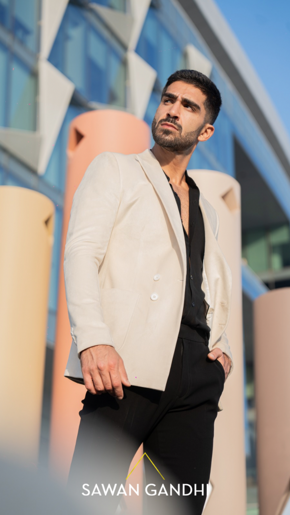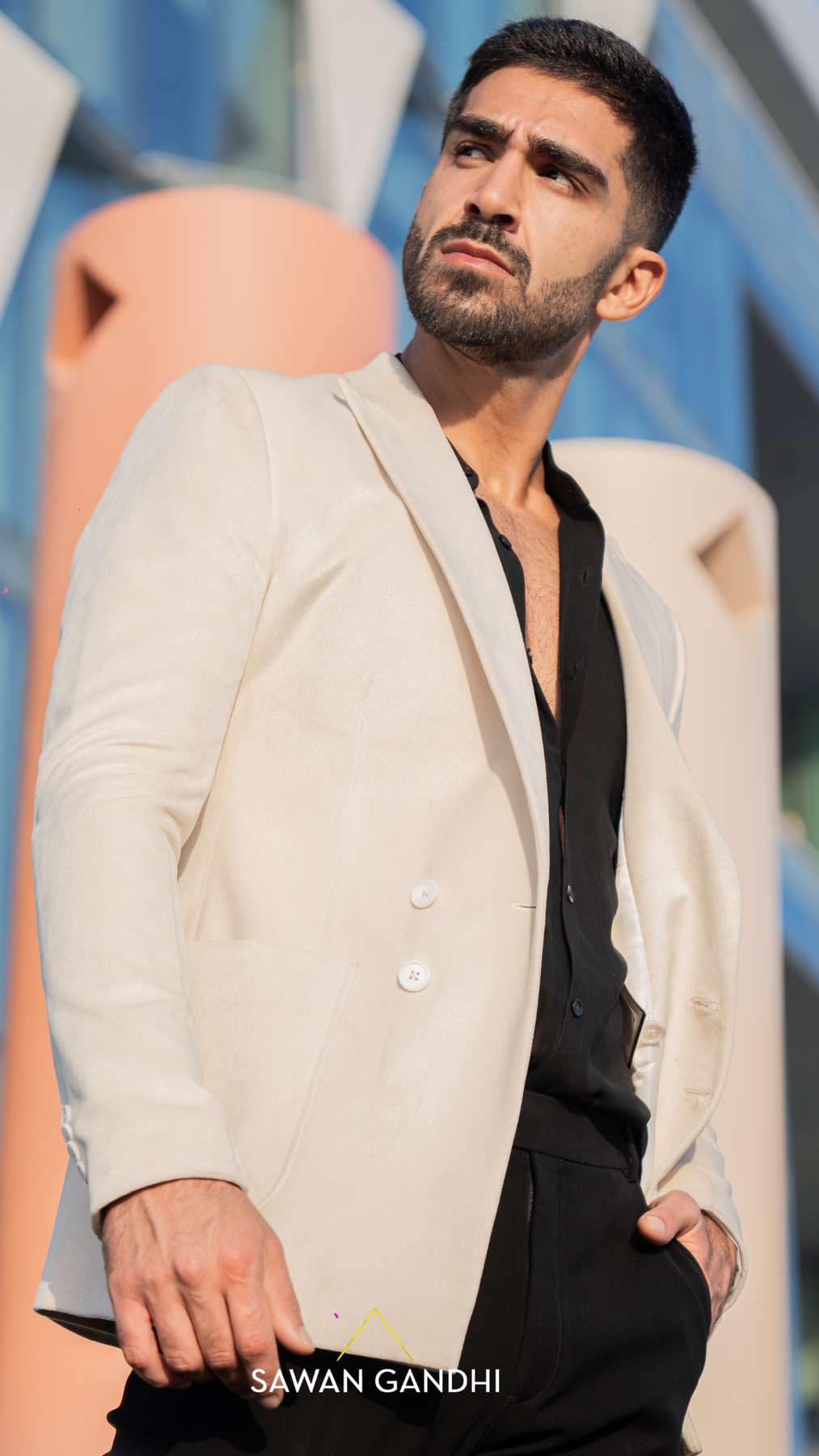 Ivory jacket with tailored pockets paired with black georgette shirtNo of pieces - 2Fabric - Suede Seperate Price:- jacket 48000, Shirt 18000