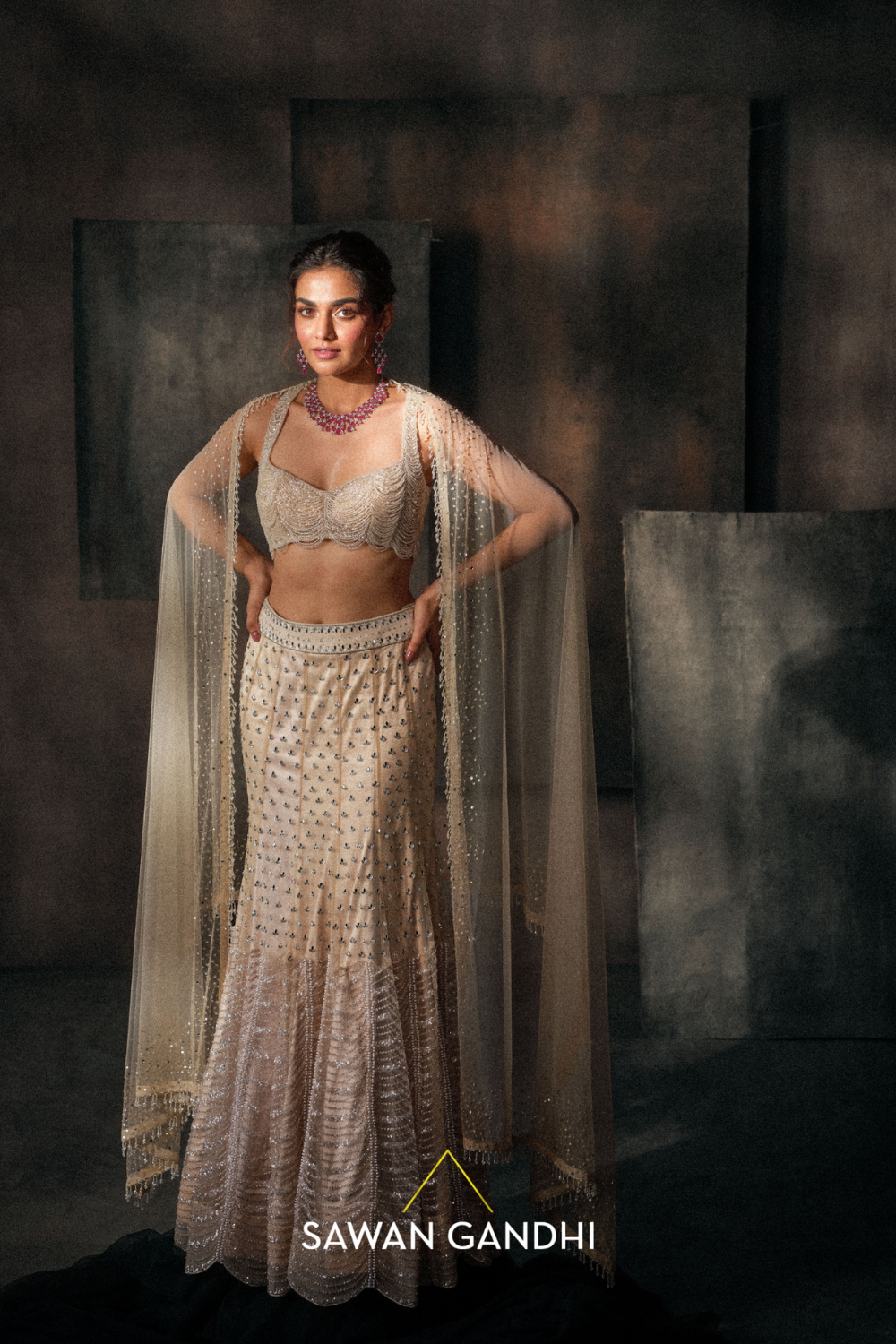 Ivory fishcut skirt with cutdana , sequins and mirror detailing paired with a tassel halter blouse and sheer sequins border dupatta.