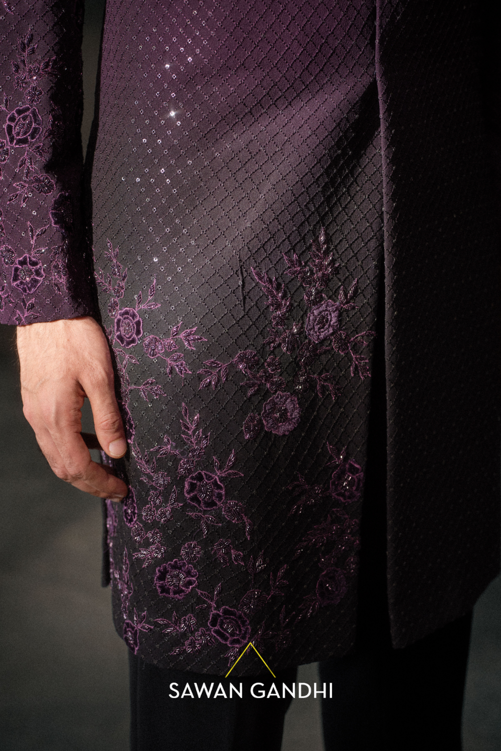 It is richly embellished with both scattered shimmering elements and intricate floral applique and embroidery work concentrated around the collar and along the sides and bottom.