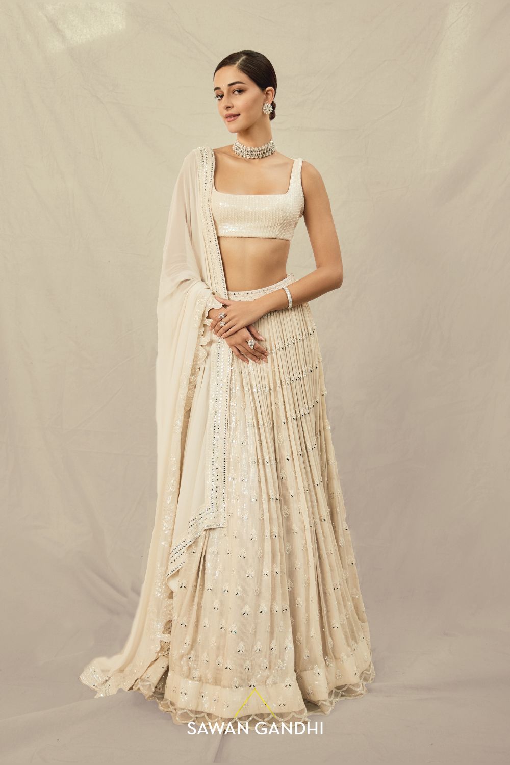 Ananya panday in Beige paani sequins mirror booti lehenga