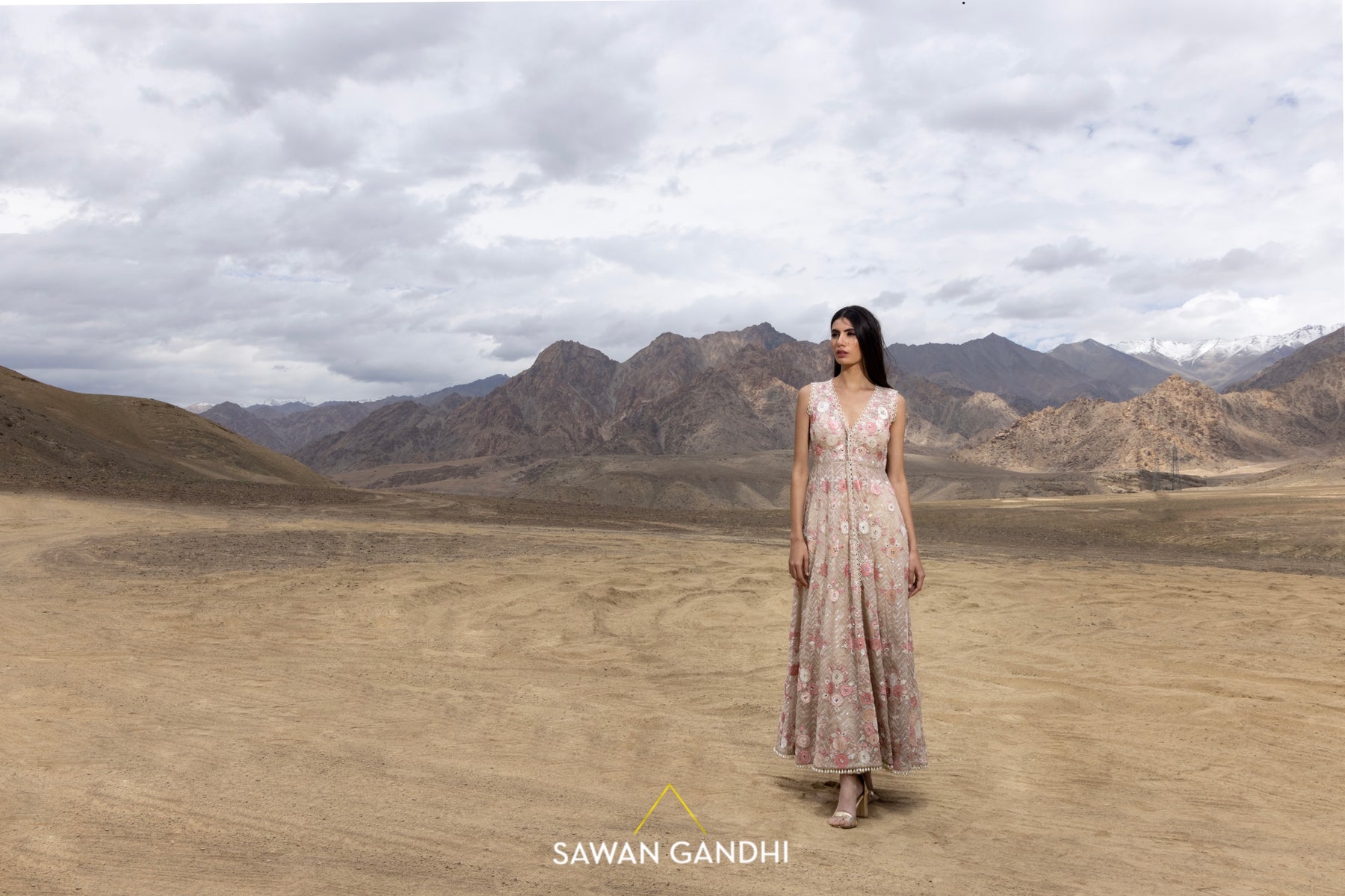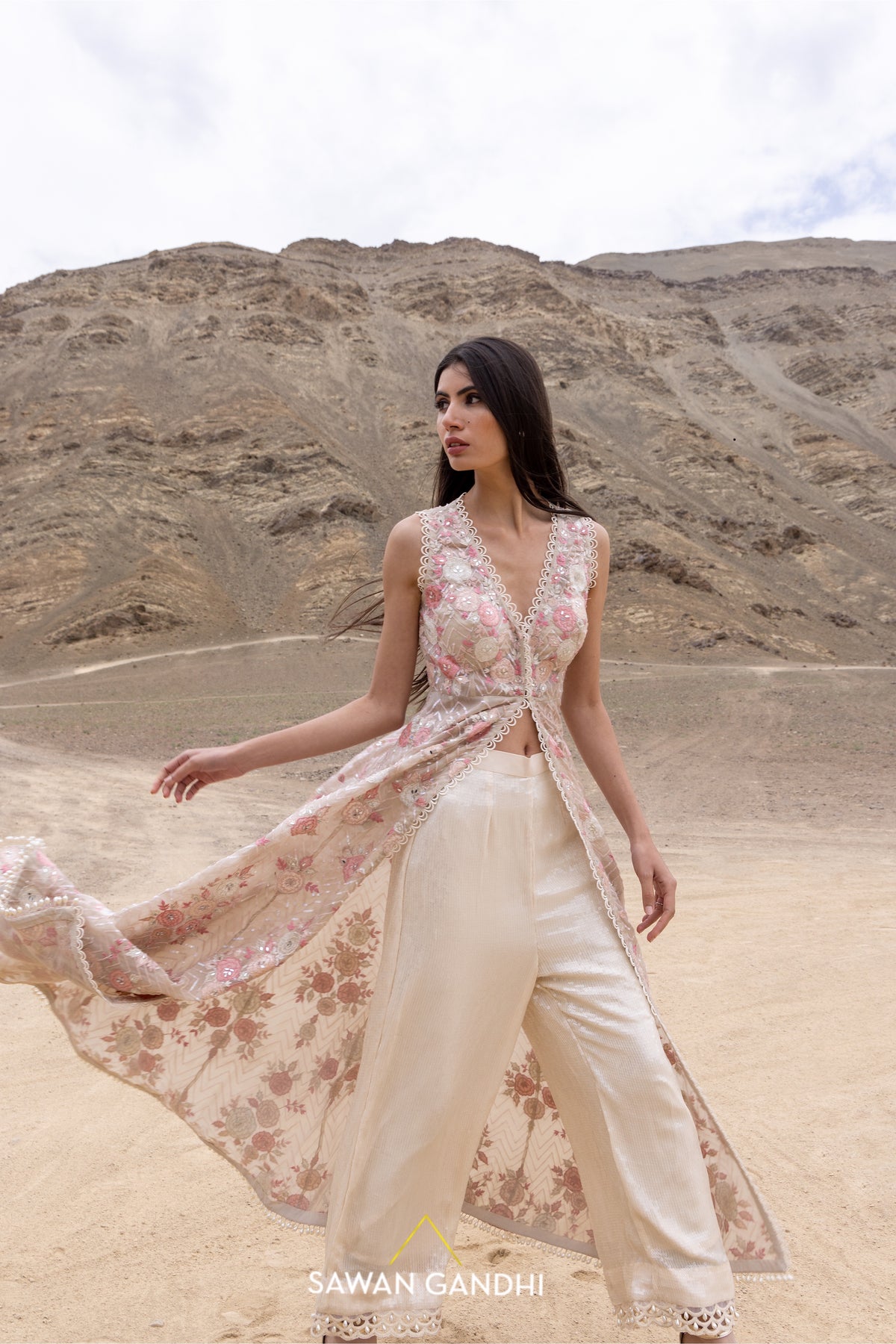Beige cape with-pink floral applique and sequins work paired with paani sequins pants