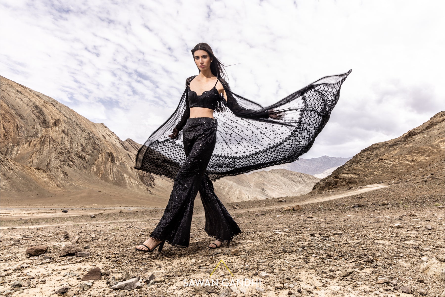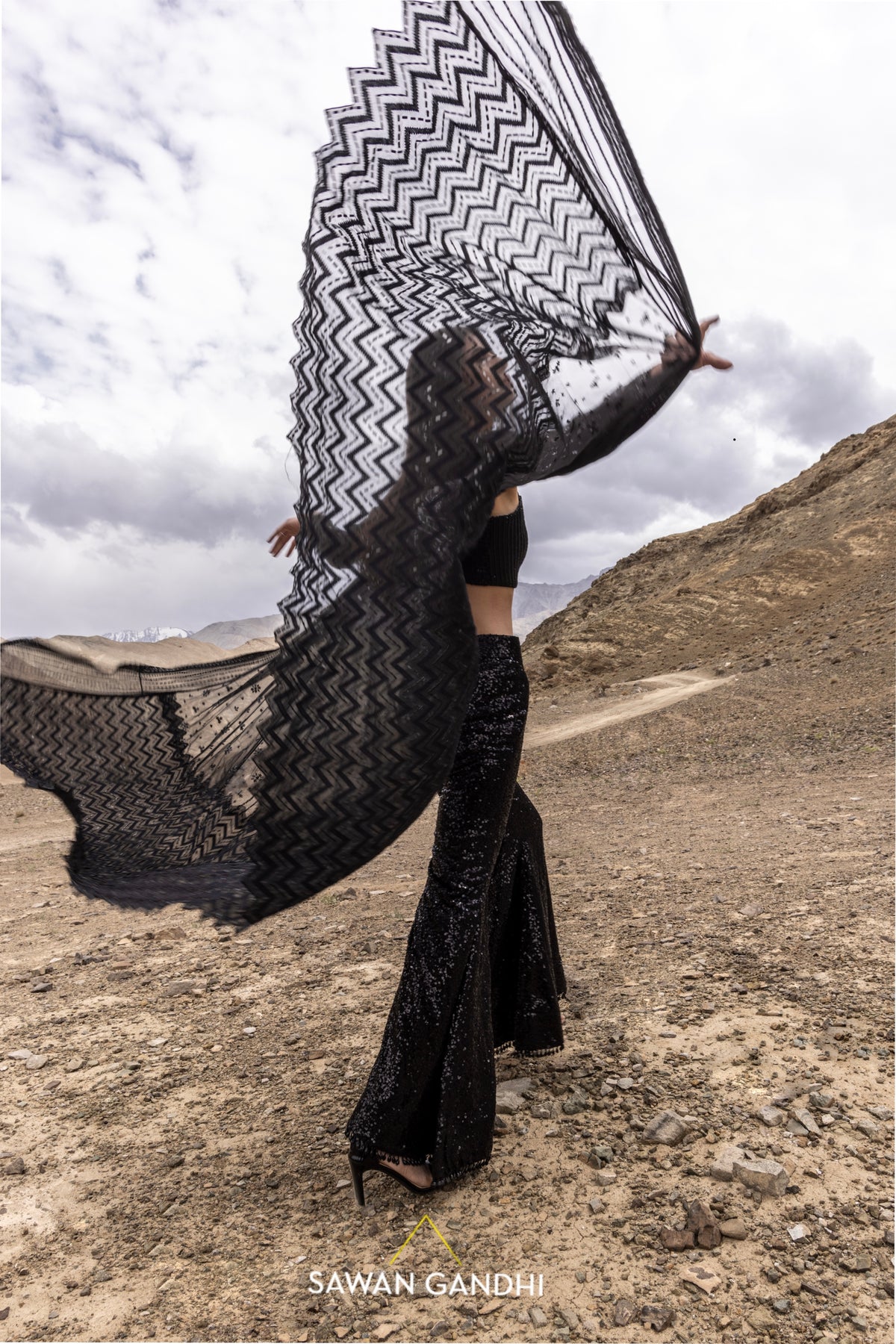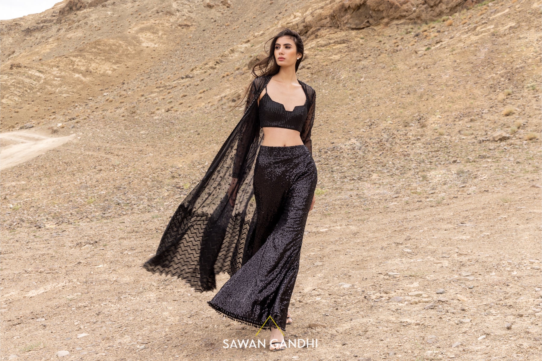 Black cutdana and sequins work cape with chevron pattern on the border paired with sequins pants and blouse