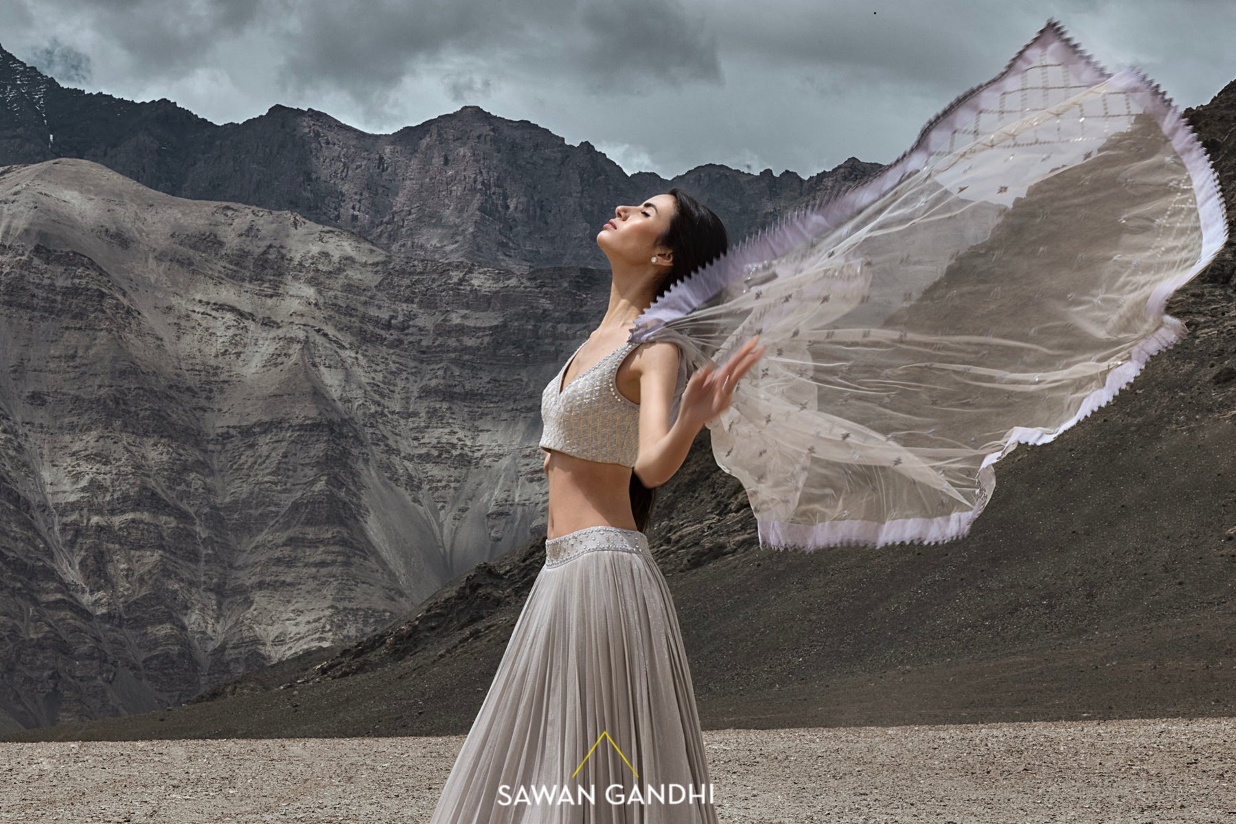 Grey paani sequins lehenga with mirror detailing paired with cutdana work blouse and net dupatta