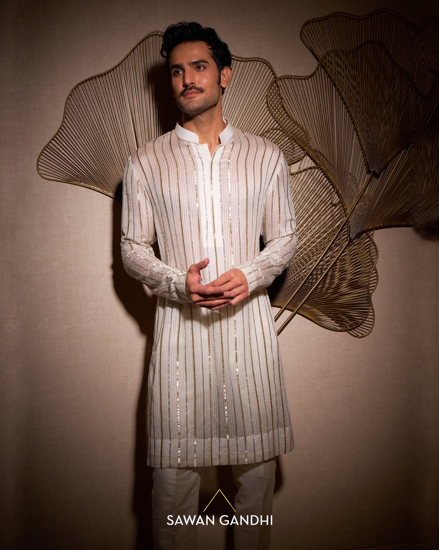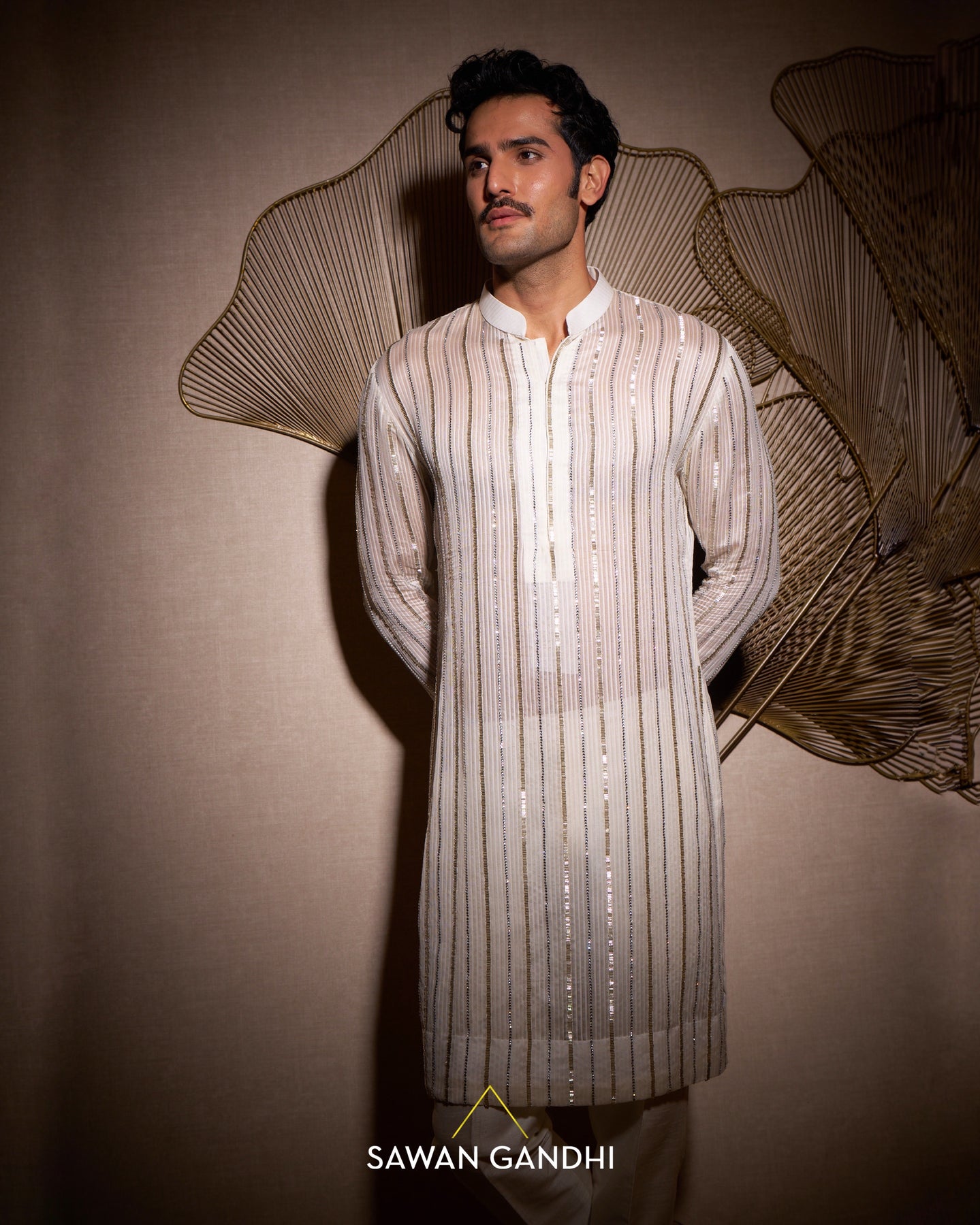 Ivory sheer gicha organza kurta with cutdana lines paired with ivory pants