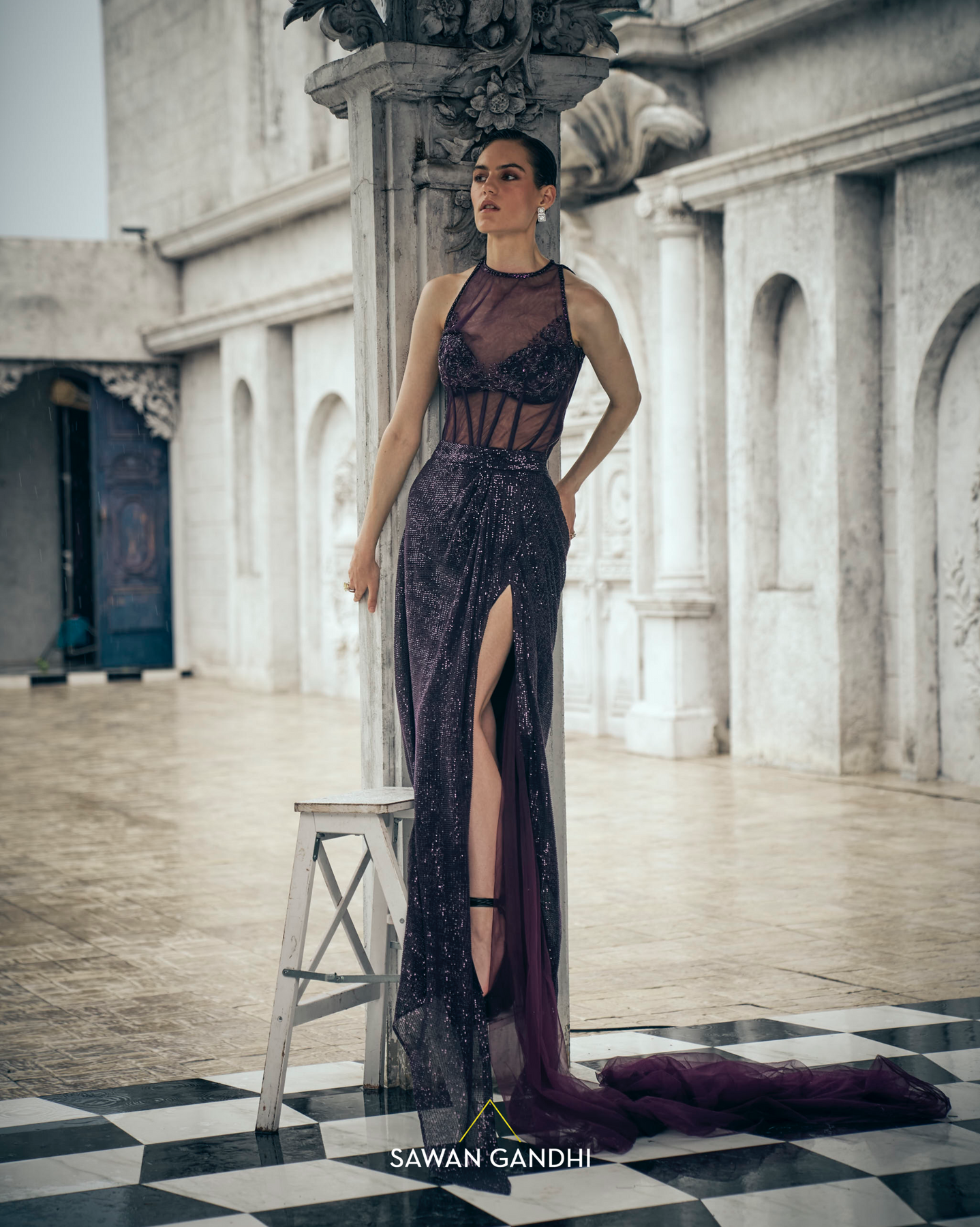Wine sequins skirt paired with a corset blouse