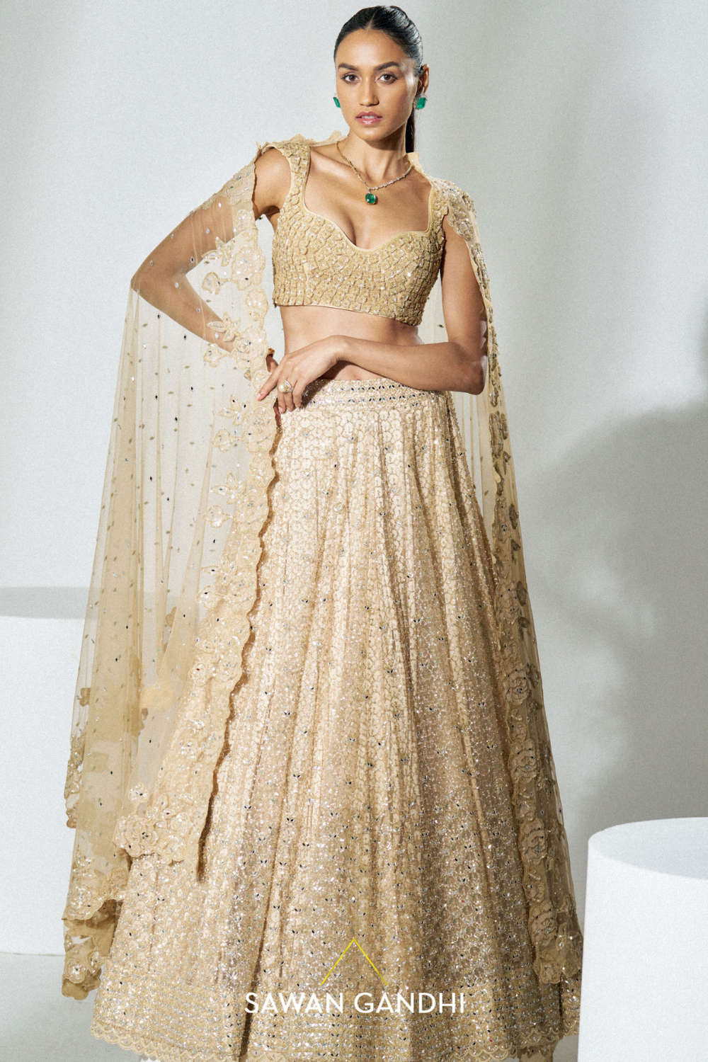 Gold beige lehenga having cutdana and sequins embroidery in honeycomb patter paired with cutwork style blouse and a net fully embroidered dupatta