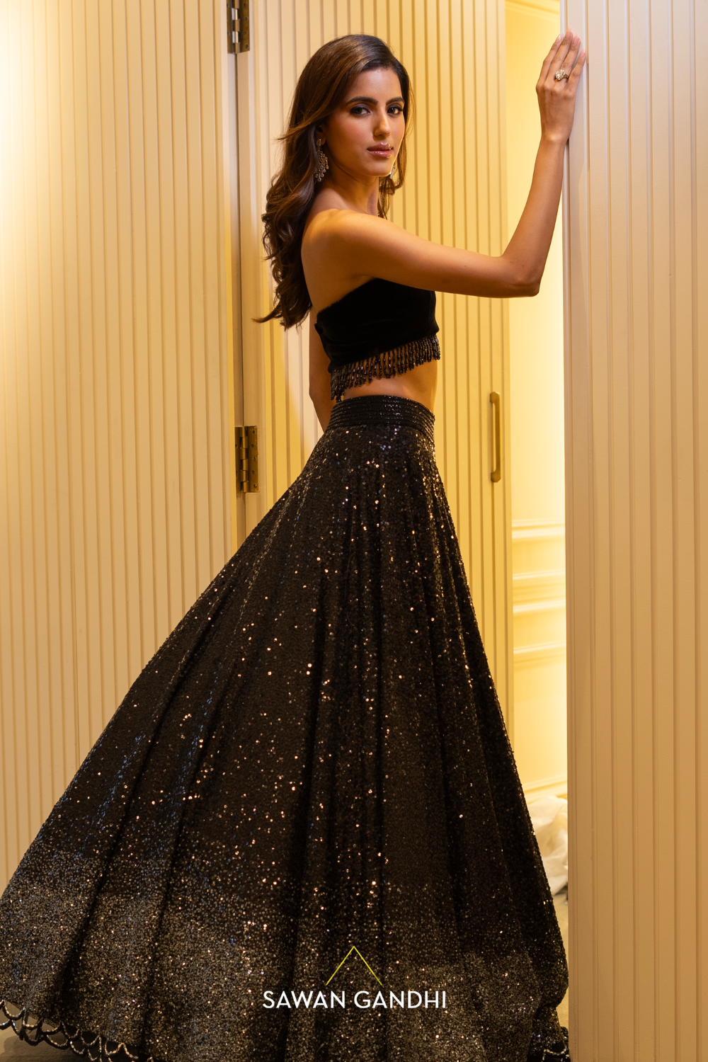 Grey to black sequins lehenga paired with a velvet tassel tube blouse