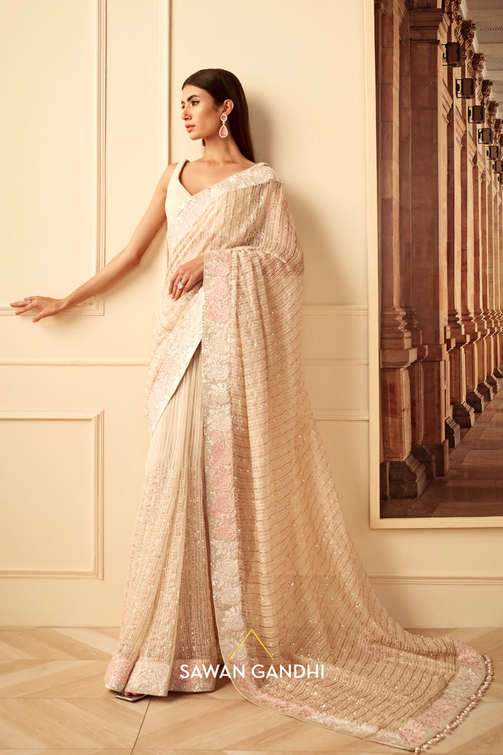 Ivory ghicha organza saree with pink floral border paired with sequins blouse and a petticoat