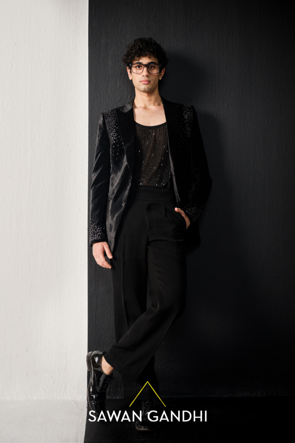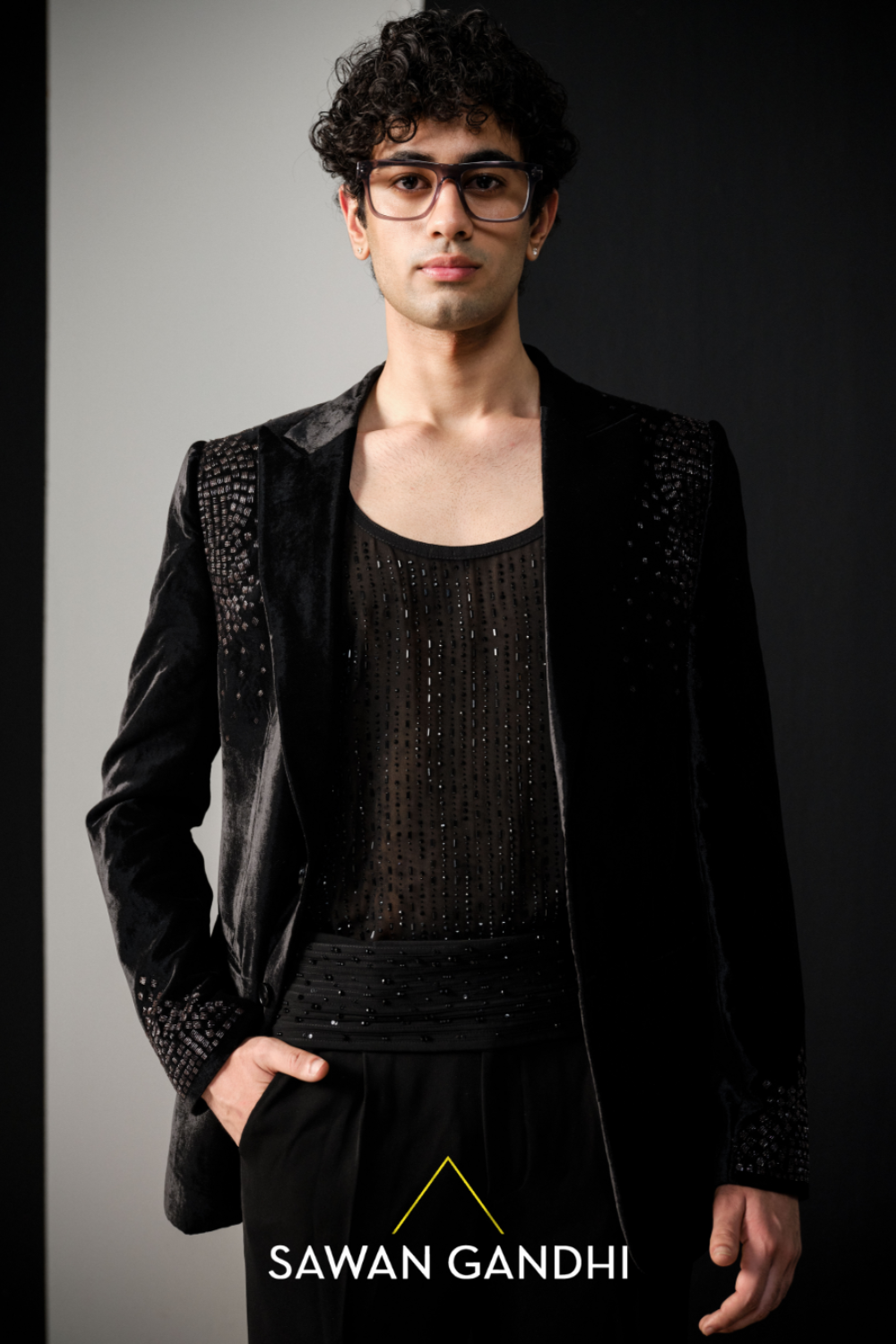 Black velvet rhombus work with cuff embellishments is paired with black pants.