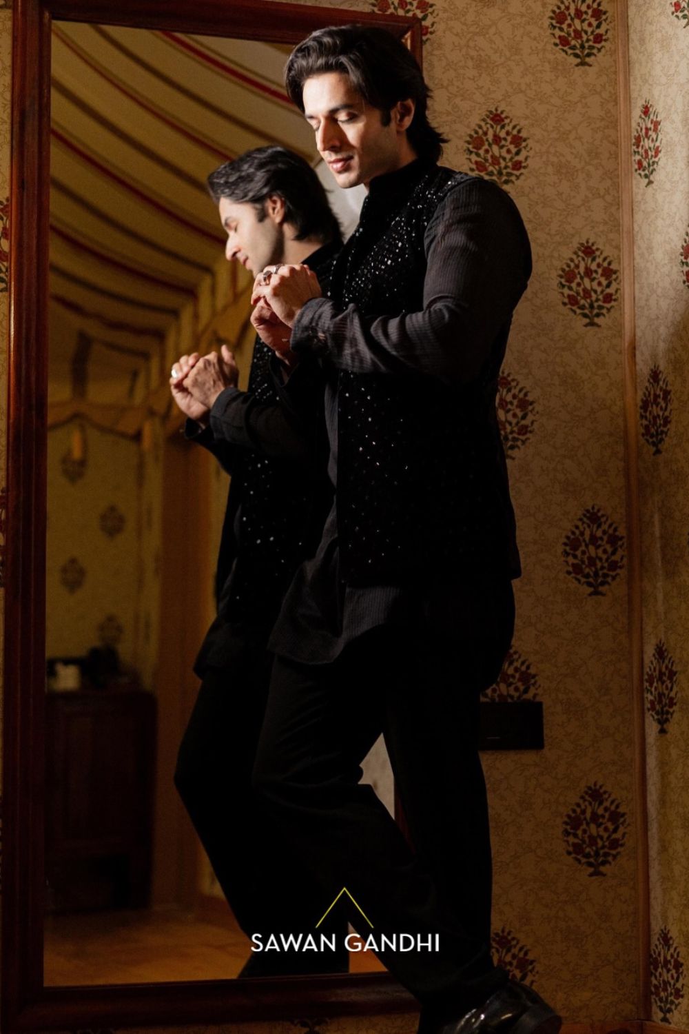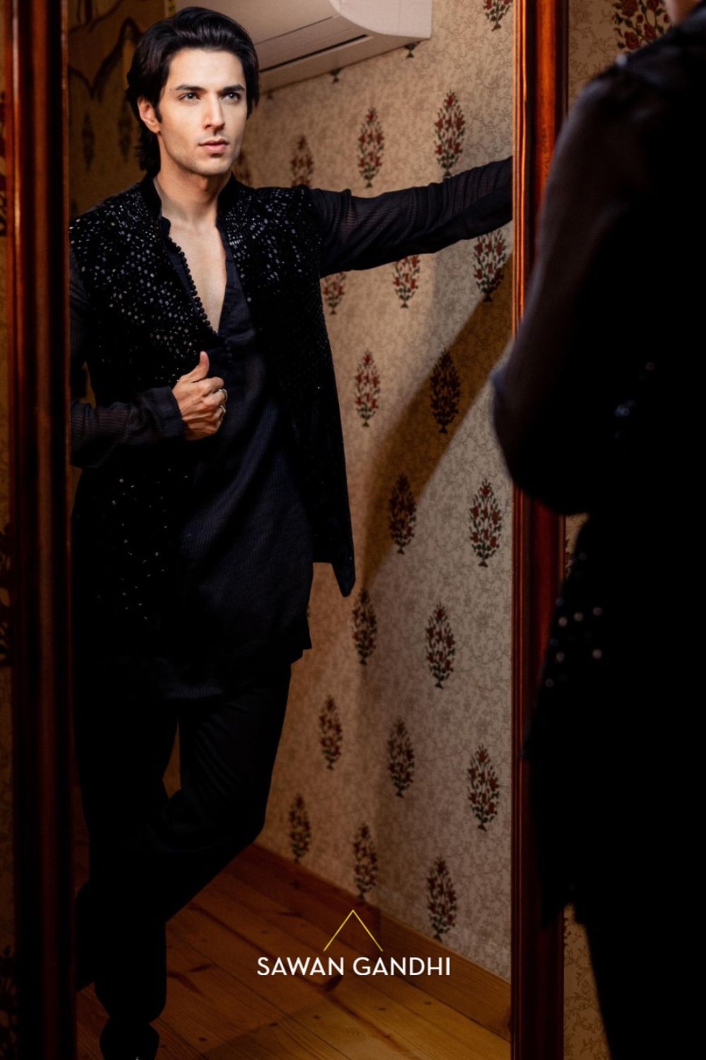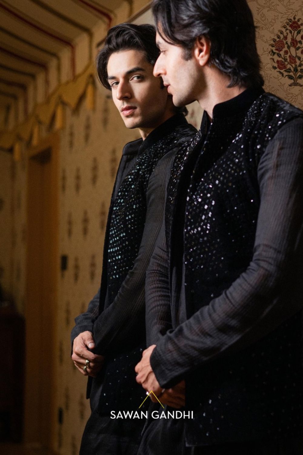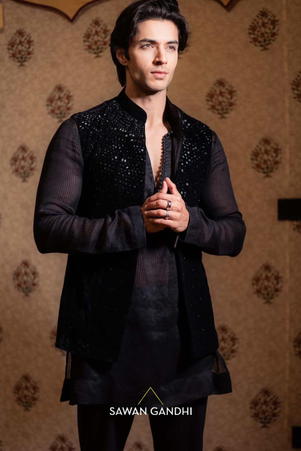 Black Velvet Nehru with scatter cutdana work paired with a ghiccha kurta and black pants