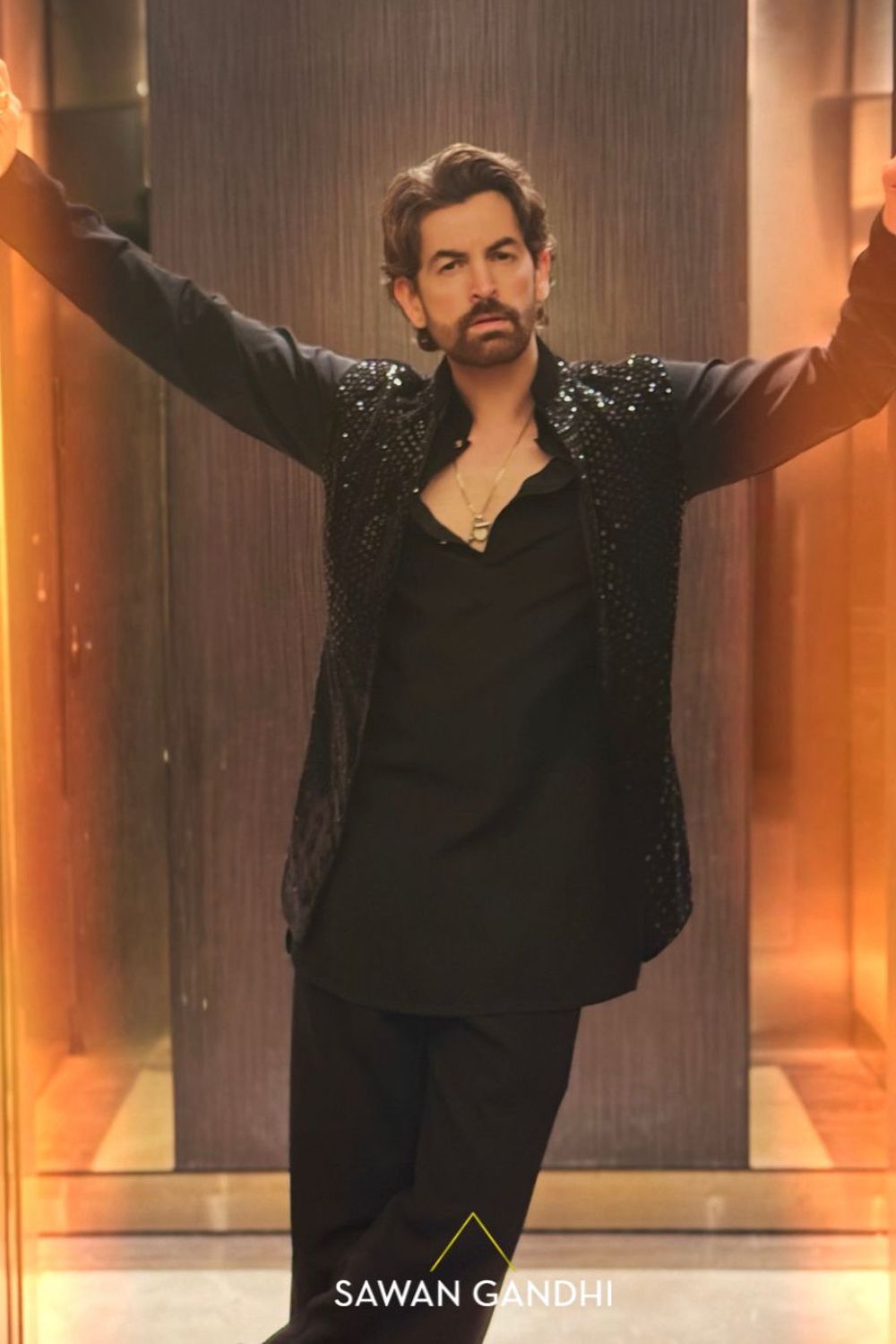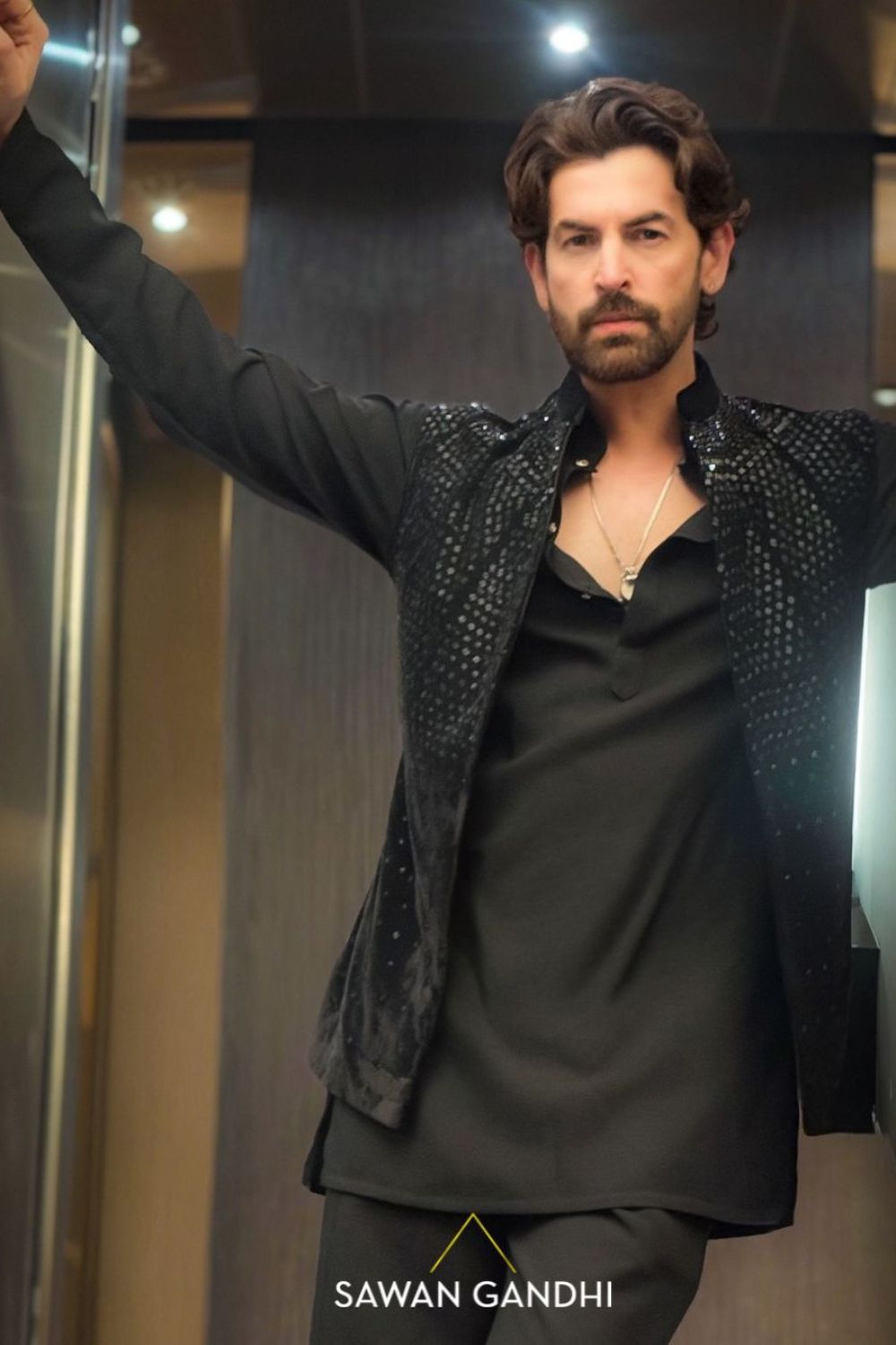 Black Velvet Nehru with scatter cutdana work paired with black pants