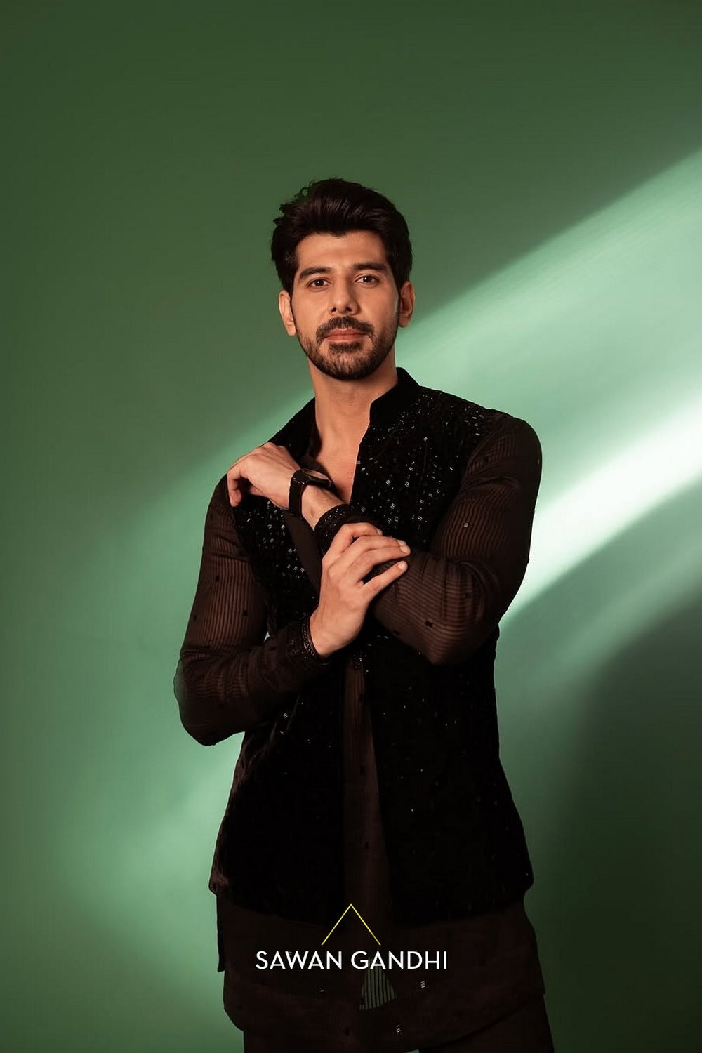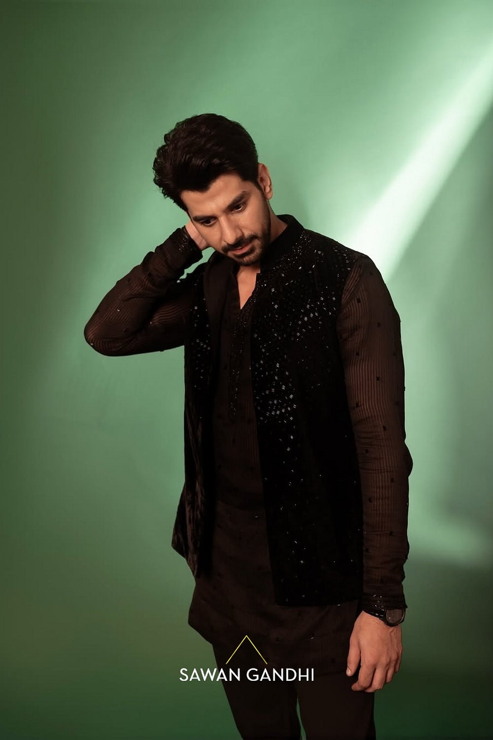 Black velvet nehru with scatter cutdana work paired with cutdana work kurta and black pants