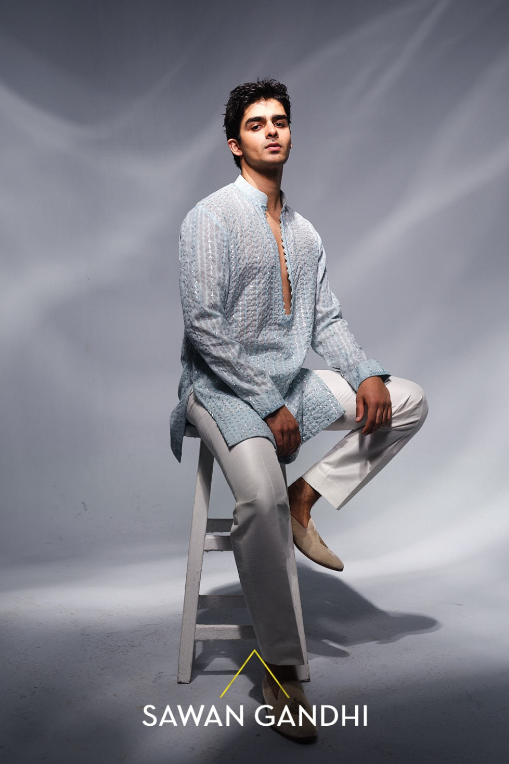Ice blue laser cut chanderi kurta with patra work embellishment kurta , pants are additionally priced at 18,000.