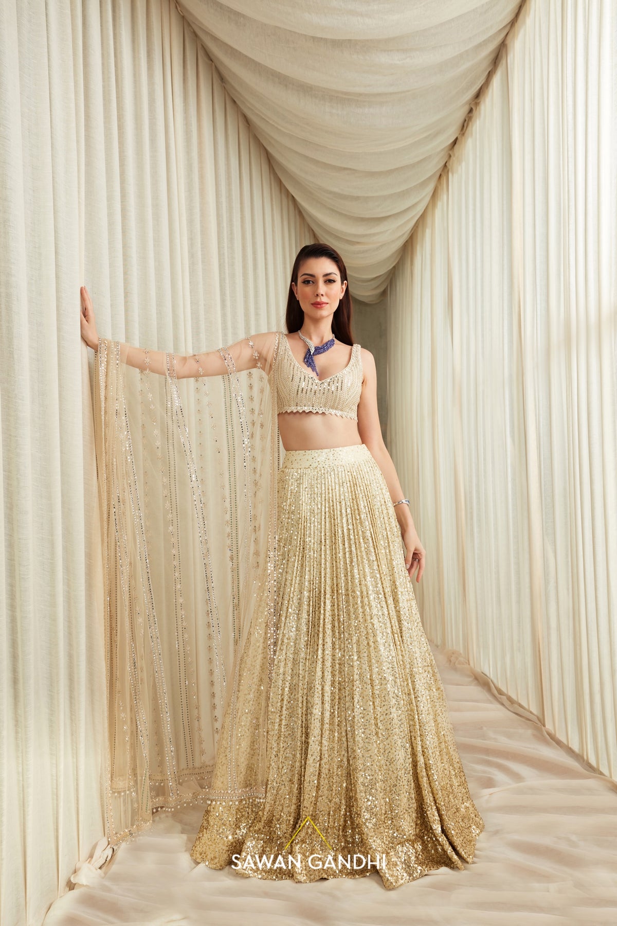 Almond lehnga with gold sequins work paired with sequins and mirror work blouse and net mirror work dupatta