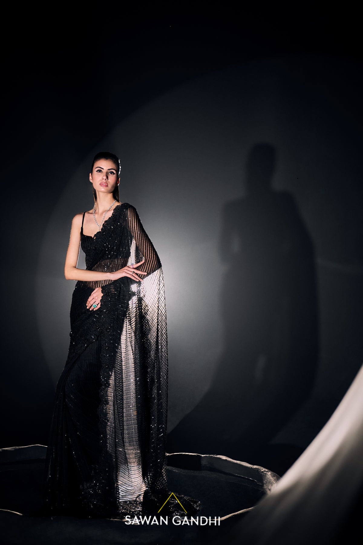 Black gicha organza saree having sequins and cutdana with floral appliqué border paired with strappy cutdana and sequins work detailing blouse and a petticoat