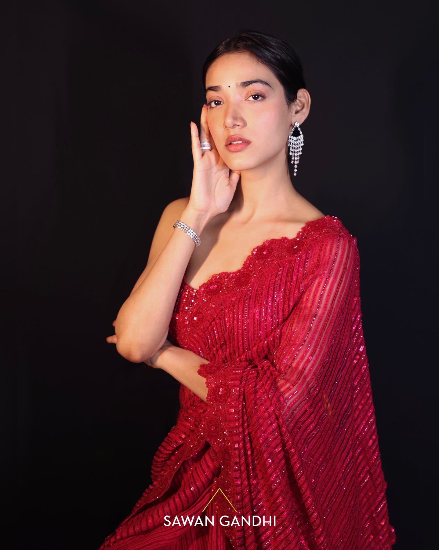 Red gicha sequins saree with appliqué work border paired with sequins blouse and a petticoat