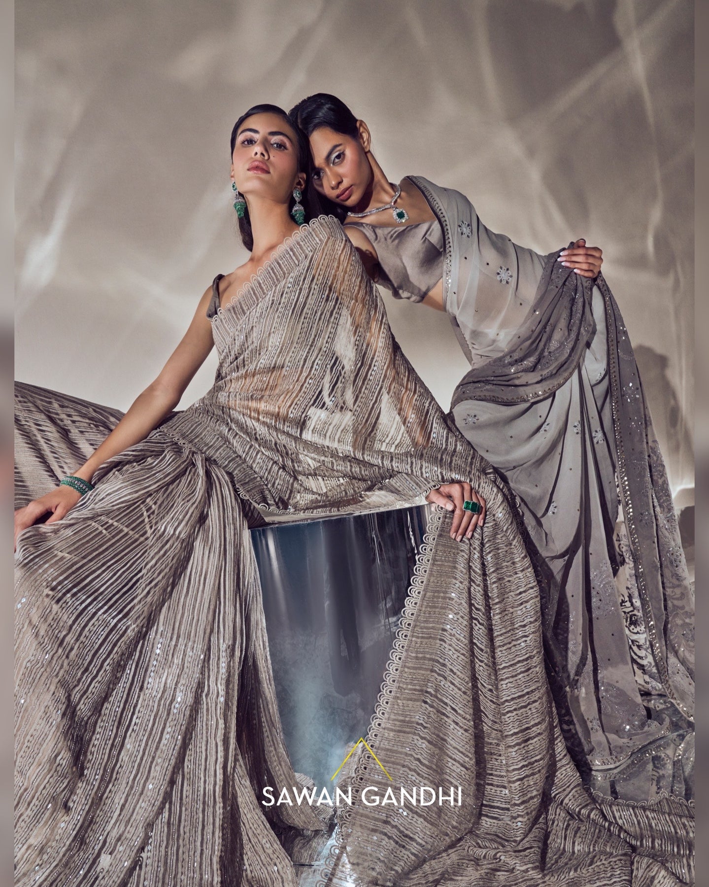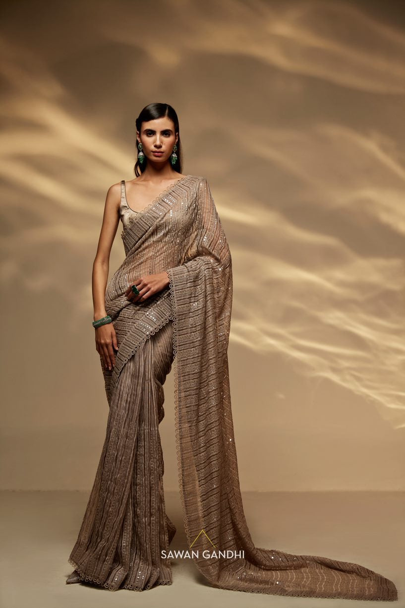 Taupe ghicha organza saree with sequins work paired with plain satin work blouse and petticoat.