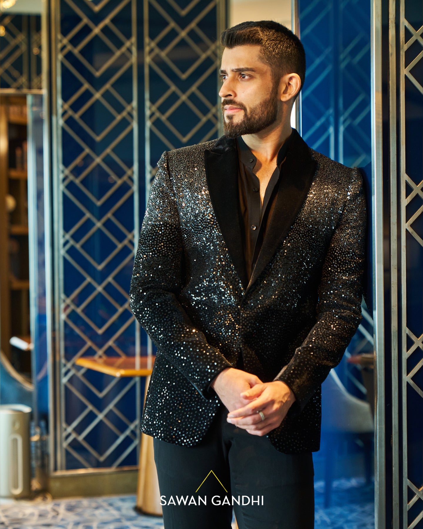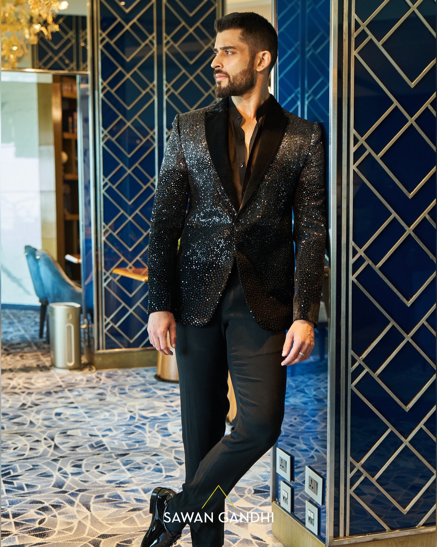 Black velvet jacket with sequins in ombré from silver to black paired with black pants