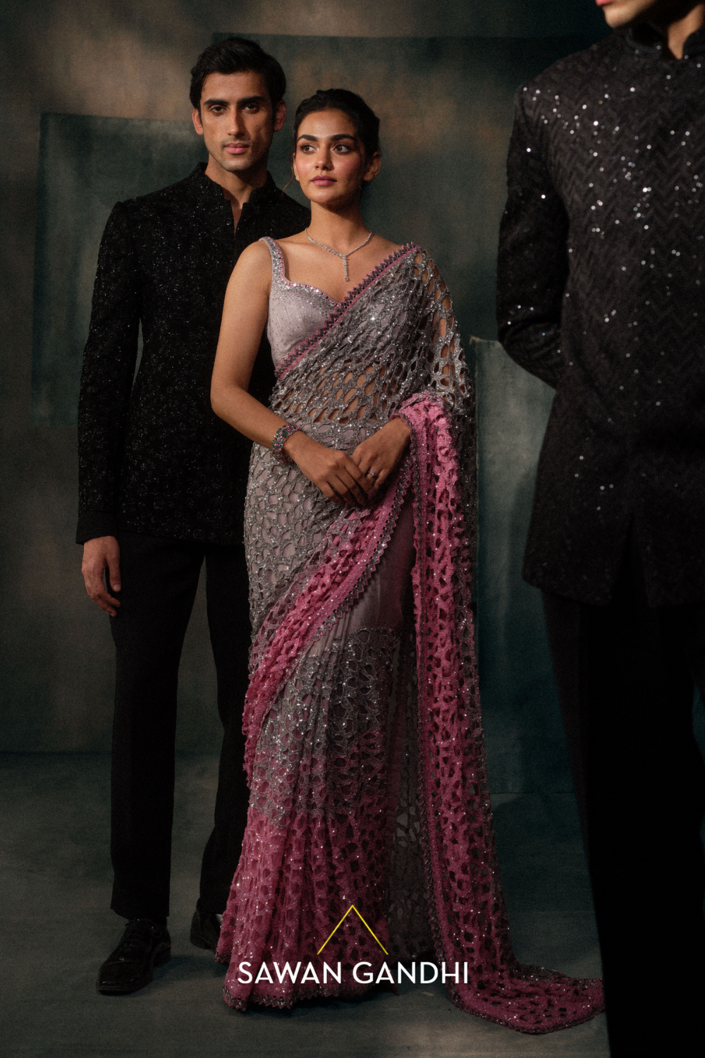 Silver to pink cutwork ombre sequins saree paired with sequins blouse.