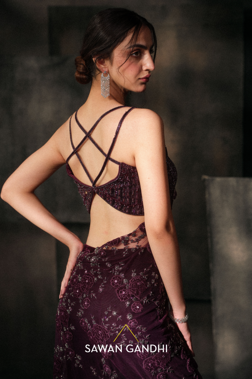 Wine velvet sharara set with applique and cutdana embroidery drape and cutdana work blouse.
