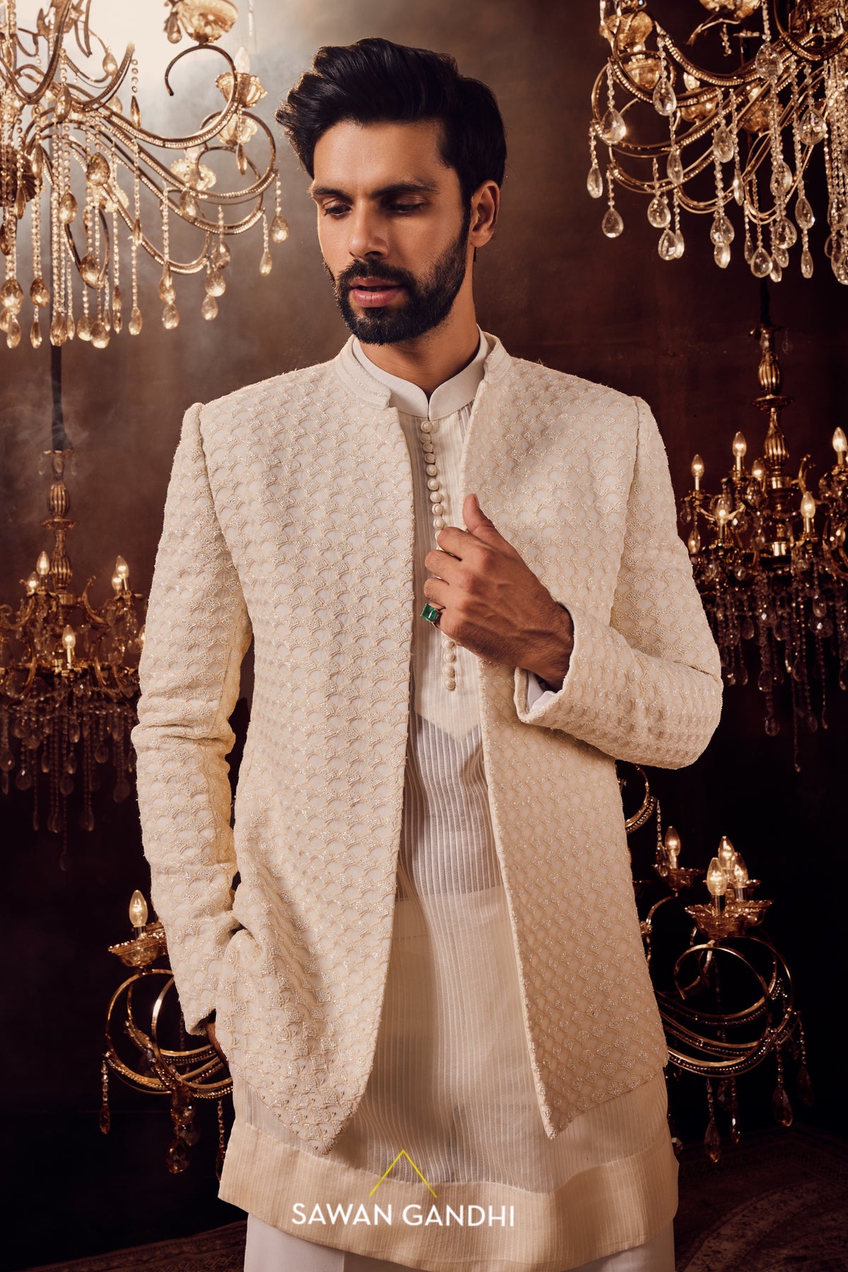 Ivory Georgette fish scale open style bandhgala having cutdana work paired with ivory silk pants and ivory kurta