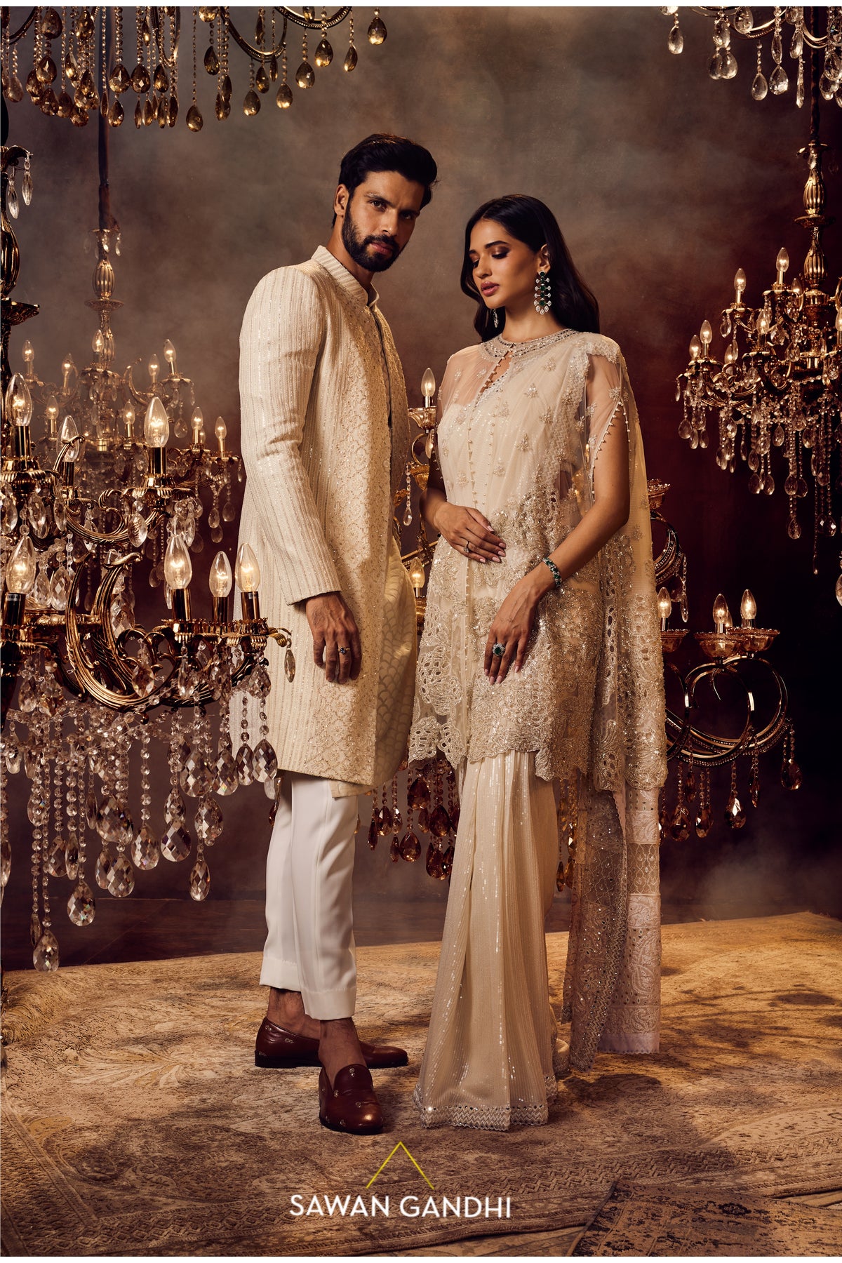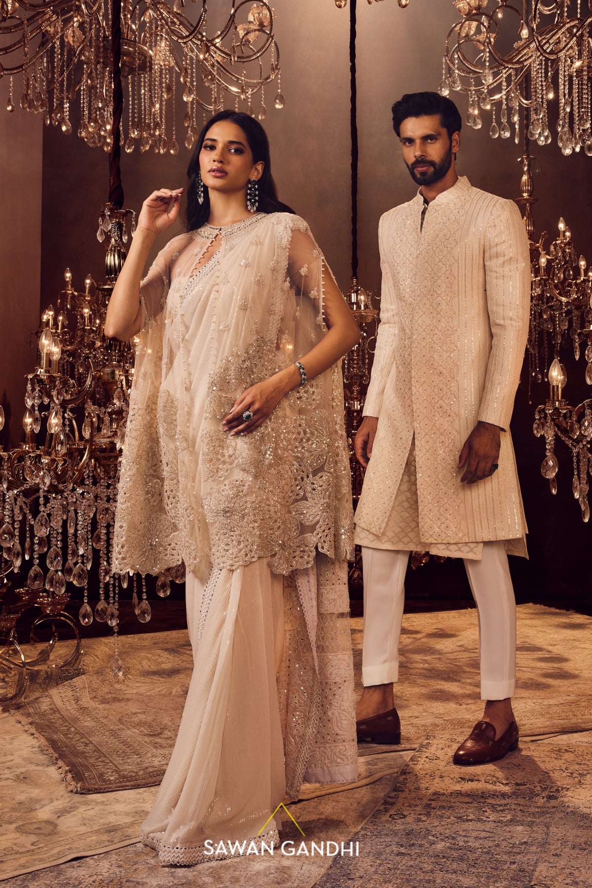 Ivory paani sequins saree with Chikankari work on the palla paired with a bustier blouse and a net cape with coral flower sequins work detailing and a petticoat