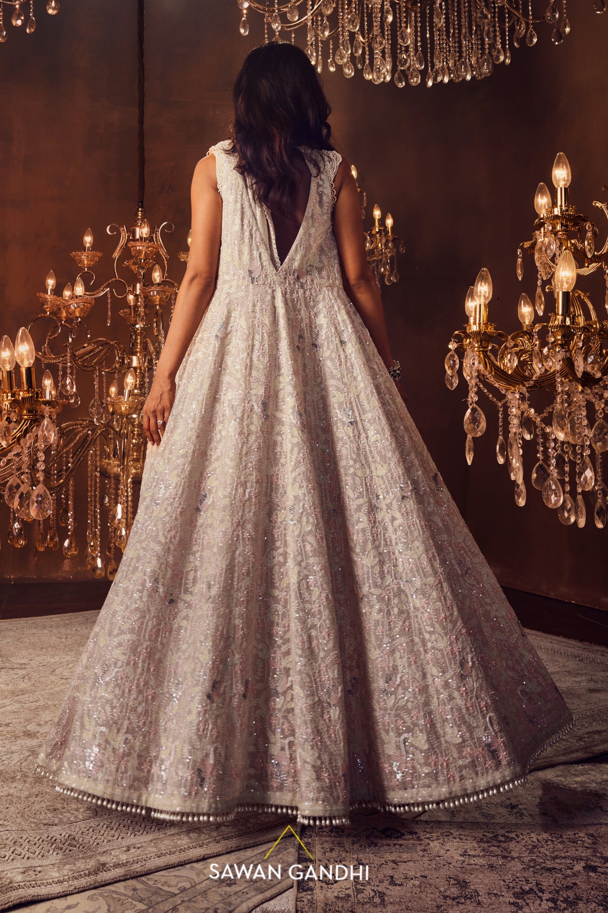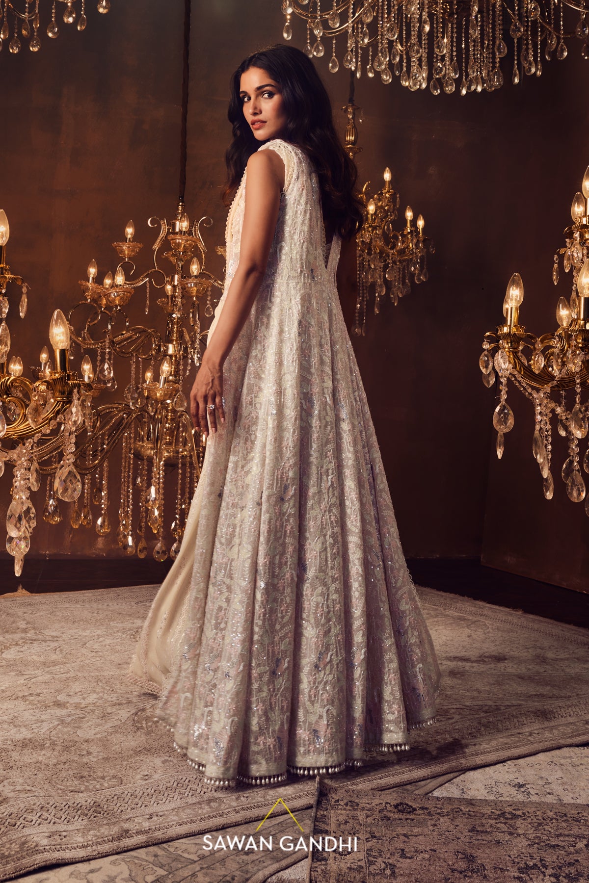 Ivory swan threadwork cape with sequins and cutdana embroidery all over paired with ivory sequins pants