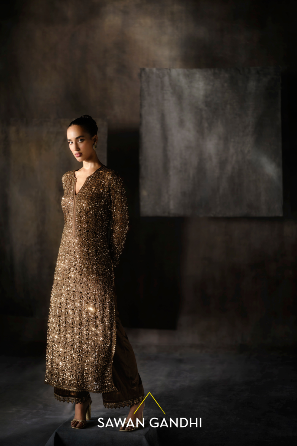 Coffee Gold cutwork sequins suit. It is paired with pants and a bustier.
