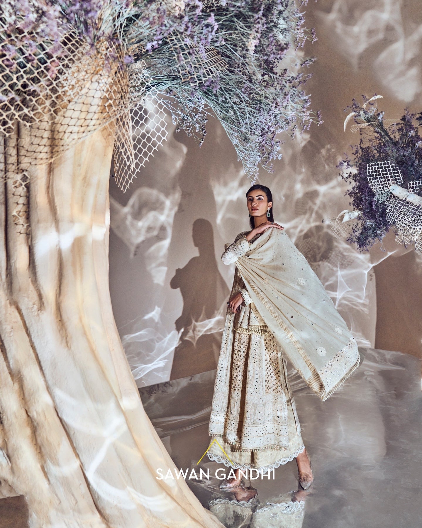 Ivory chikankari suit with mukaish, sequins, and mirror work detailing paired with sequins work plazzo pants and georgette dupatta having chikankari borders and pearl drop tassels at the bottom.